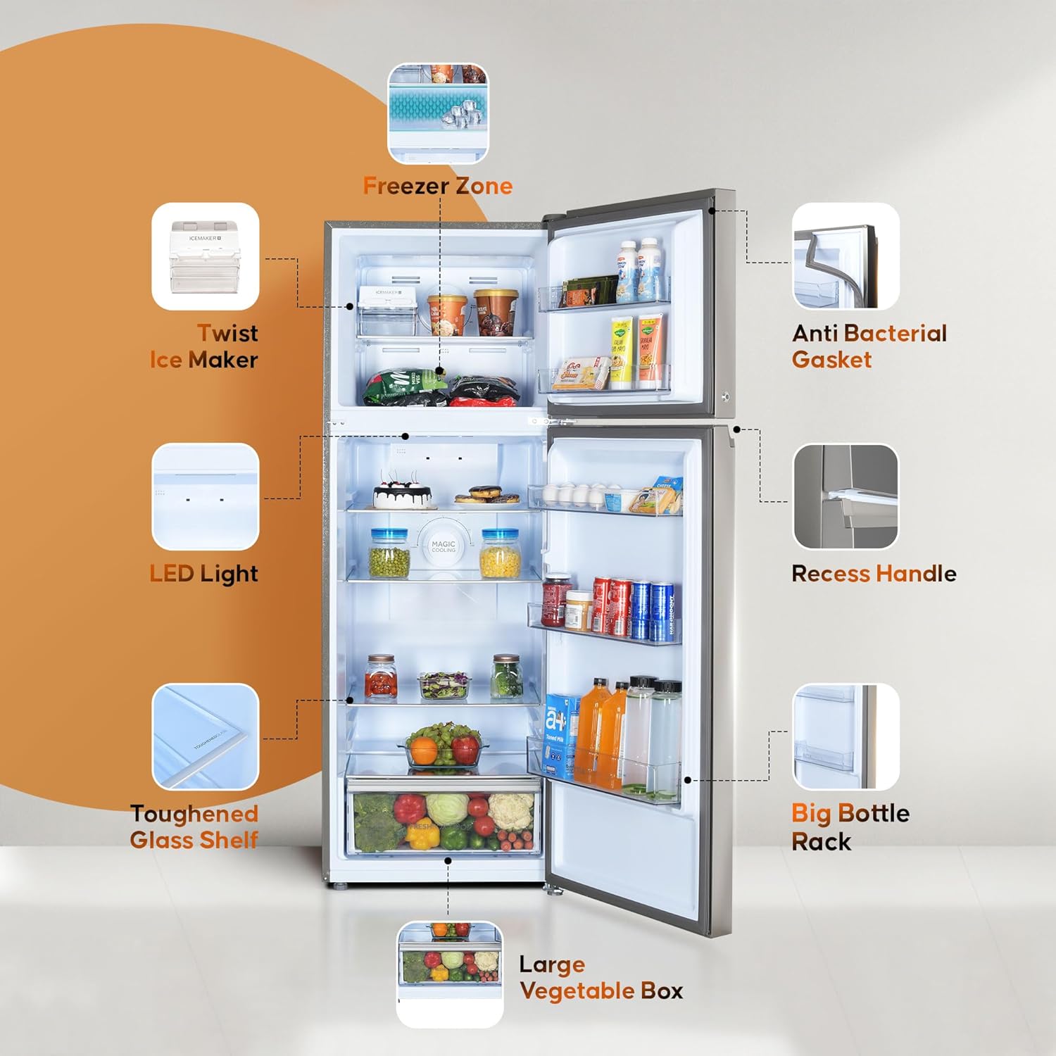 Additional Features : Large Veg Box | LED Light | Recess Handle | Easy Clean Back | Auto Connect to Home Inverter.