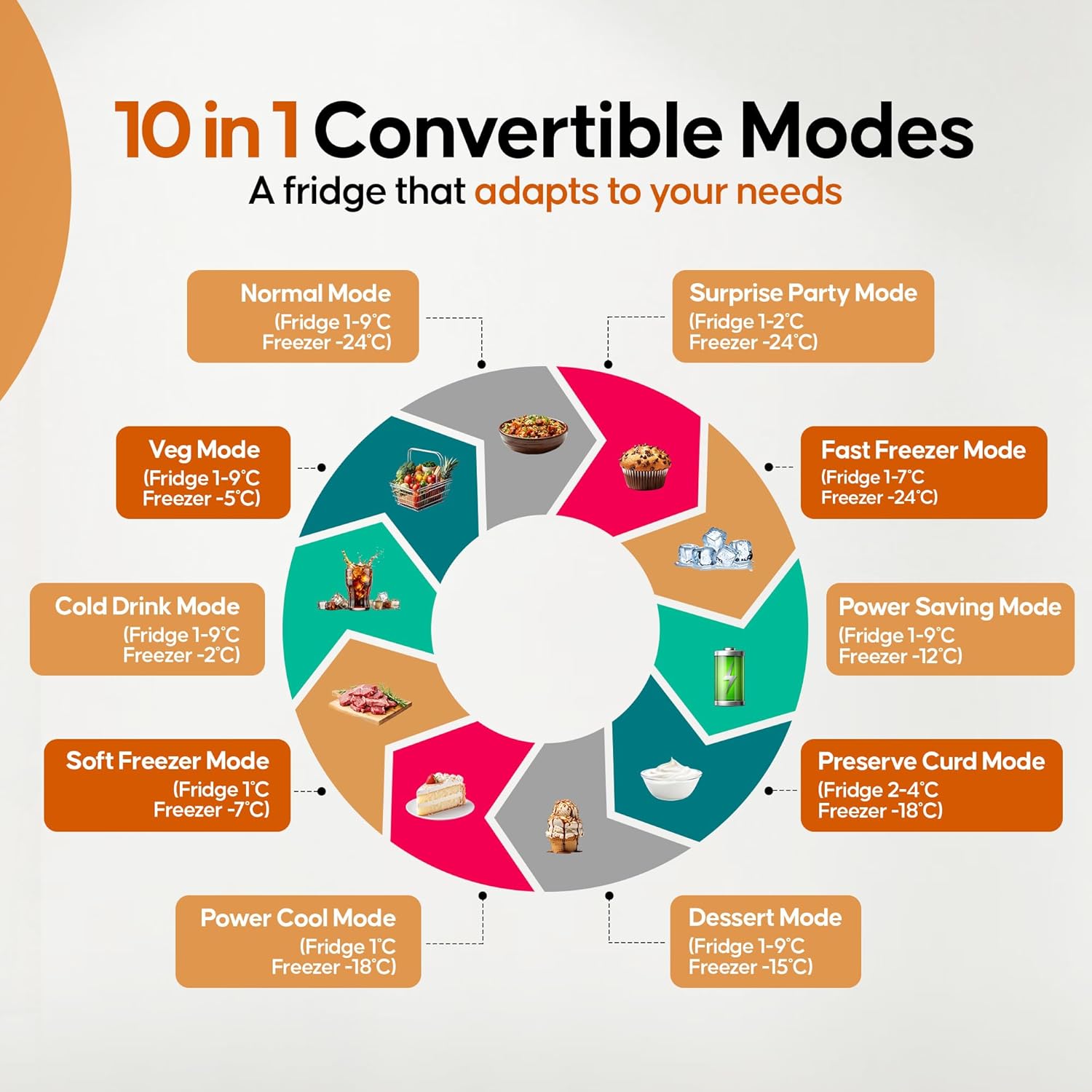 Frost Free Refrigerator: Premium auto defrost with powerful cooling and long lasting freshness and performance. Manage your flexible storage needs with convertible 10 in 1 technology of this double door fridge: Normal Mode | Veg Mode | Cold Drink Mode | Soft Freezer Mode | Fast Freezer Mode | Power Cool Mode | Power Saving Mode | Surprise Party Mode | Preserve Curd Mode | Dessert Mode.