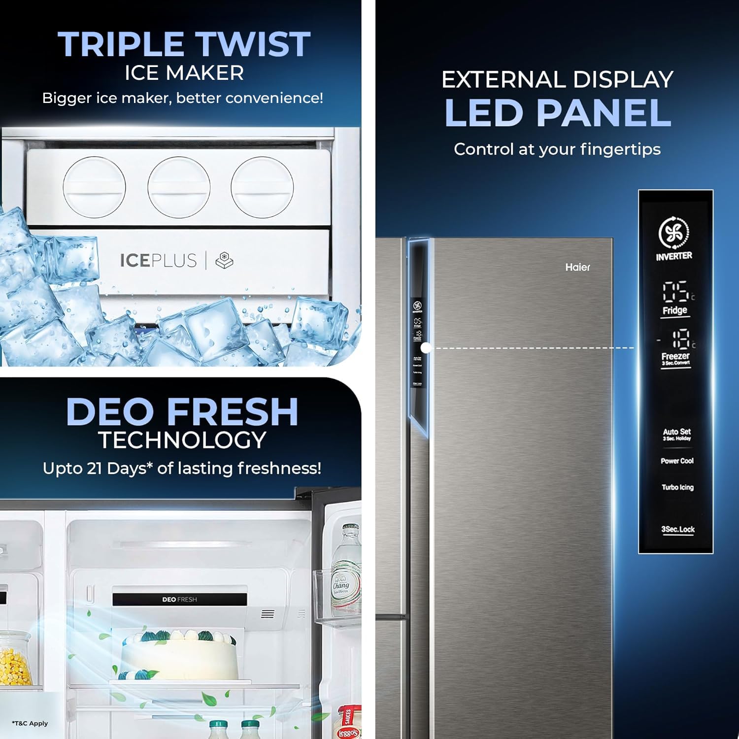 Haier SmartChoice 598L 3 Star 3-Door Side by Side Frost Free Refrigerator|Convertible|Smart Sense AI|Expert Inverter Compressor|Digital Display Panel (2025 Model, HRT-683ISU1, Inox Steel)