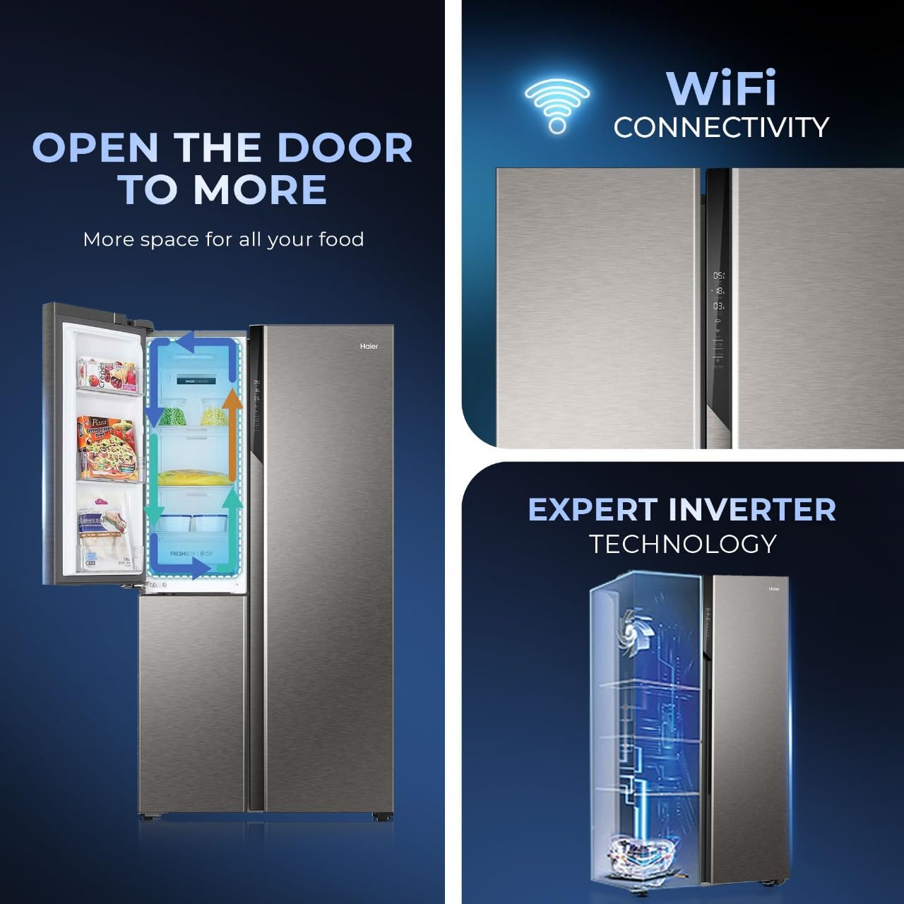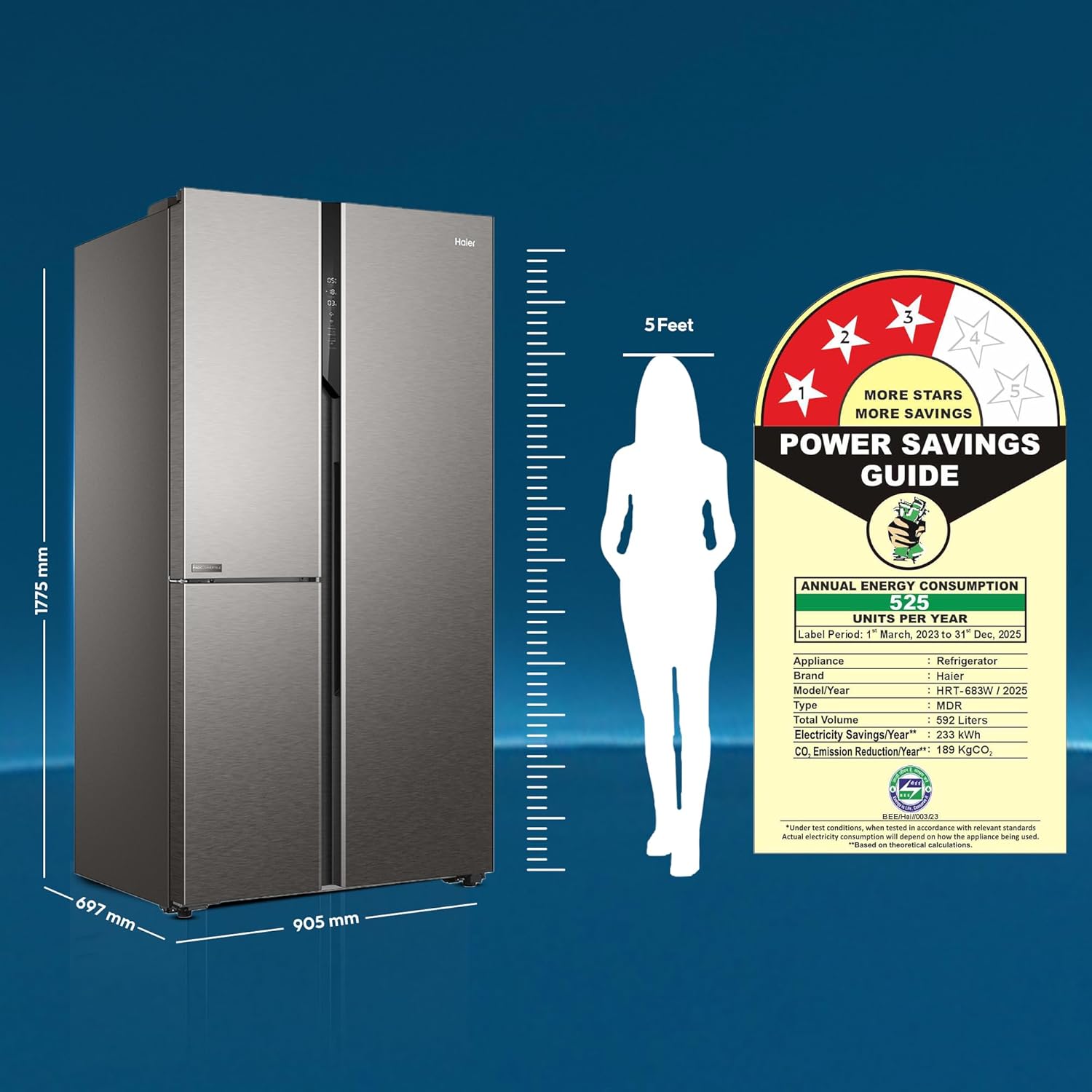 8 reviews for Haier SmartChoice 598L 3 Star 3-Door Side by Side Frost Free Refrigerator|Convertible|Smart Sense AI|Expert Inverter Compressor|Digital Display Panel (2025 Model, HRT-683ISU1, Inox Steel)