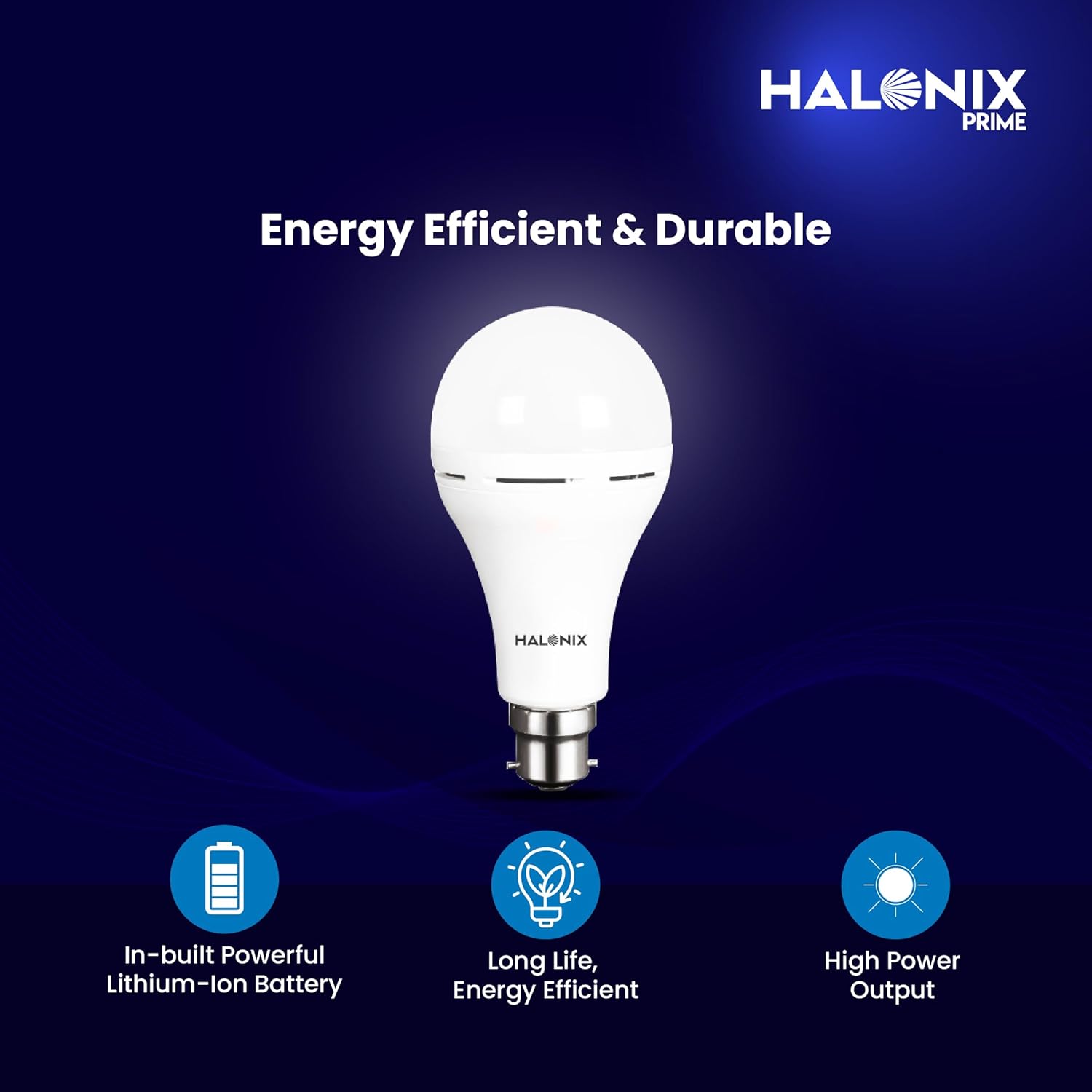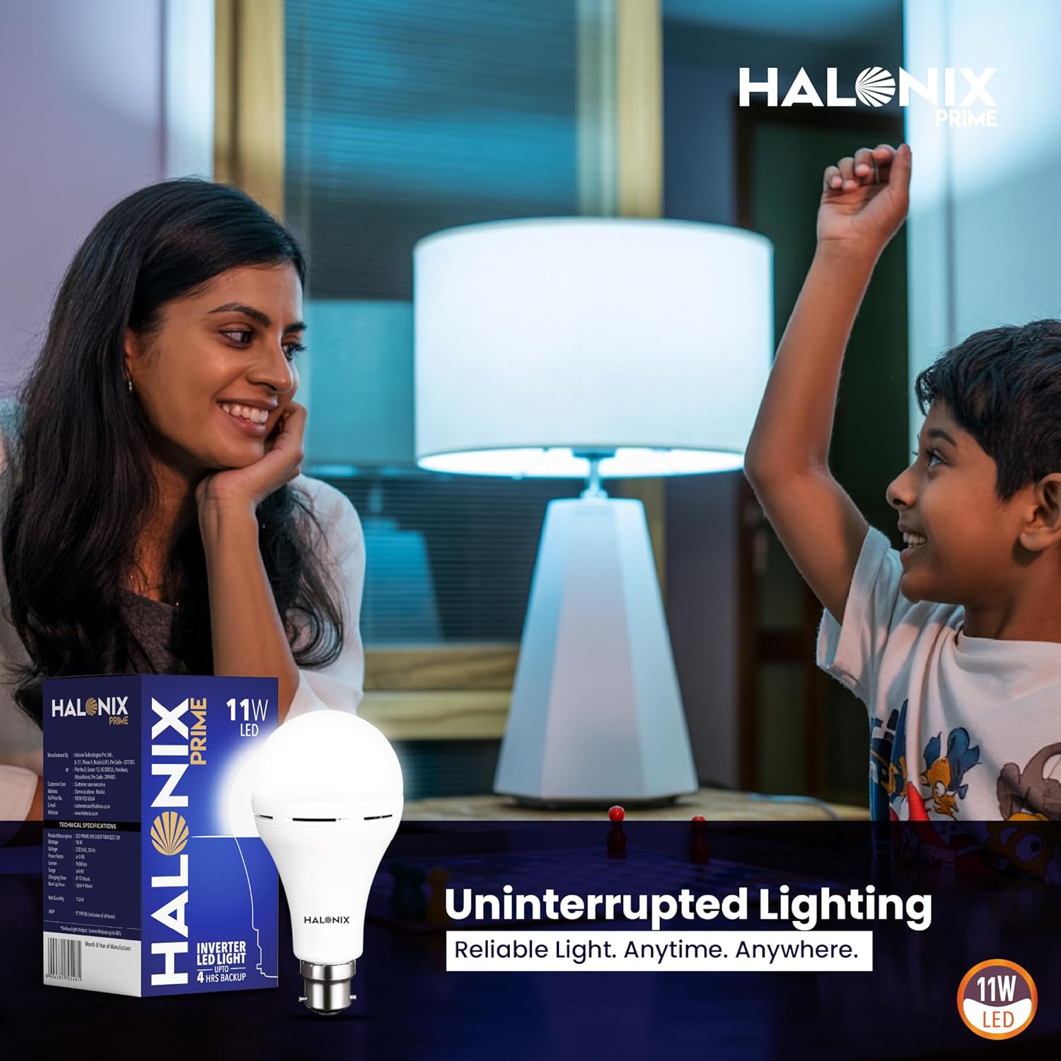 Halonix 11W Inverter led bulb with B22D base, offering white light, rechargeable inverter capability, and emergency functionality.