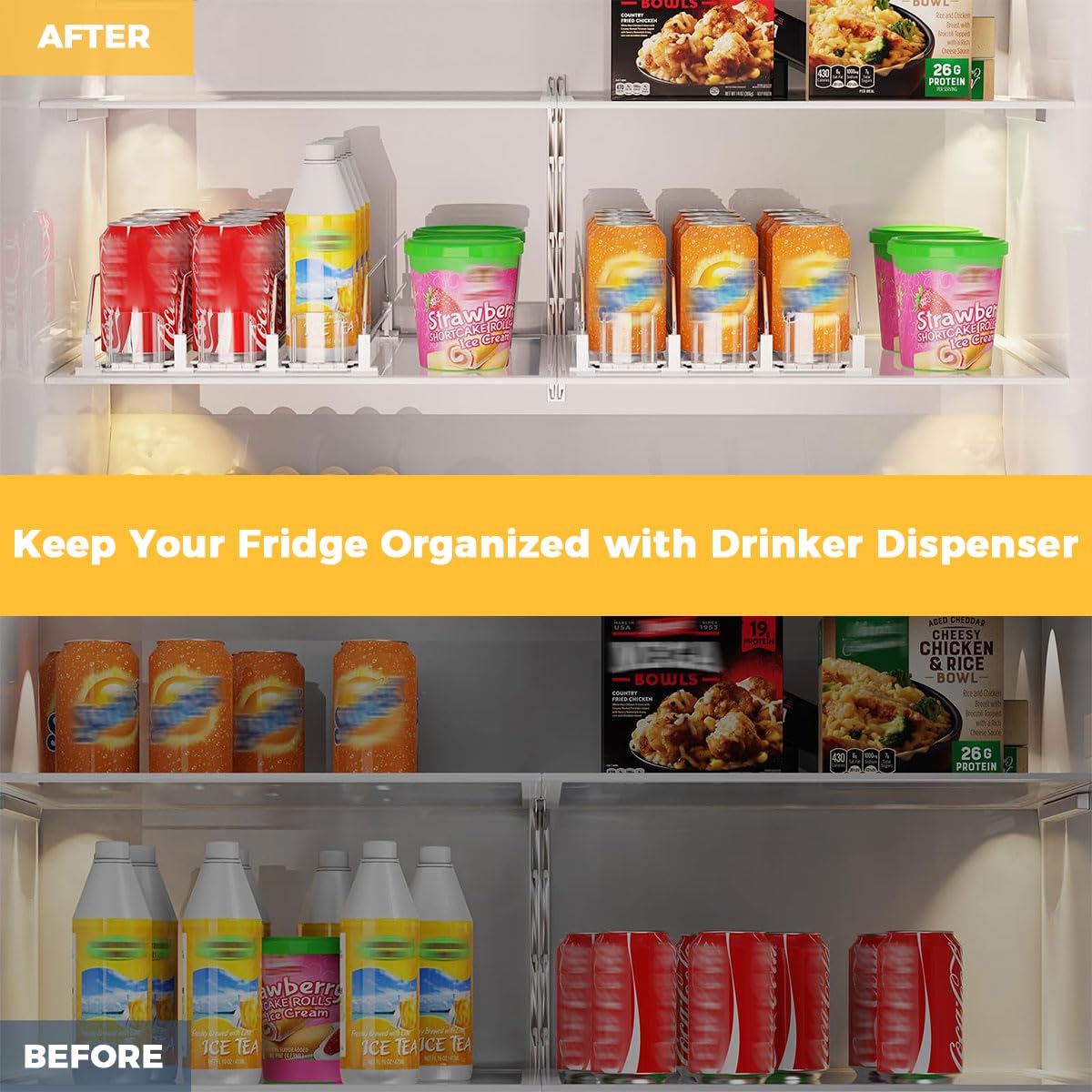 VERSATILE FIT FOR CANS & BOTTLES: Designed to accommodate various beverage containers, this organizer is perfect for zip-top cans, soft drinks, and short bottles. Its universal fit provides a practical storage solution for different drink sizes and shapes, ensuring your entire beverage selection is kept tidy and within easy reach.