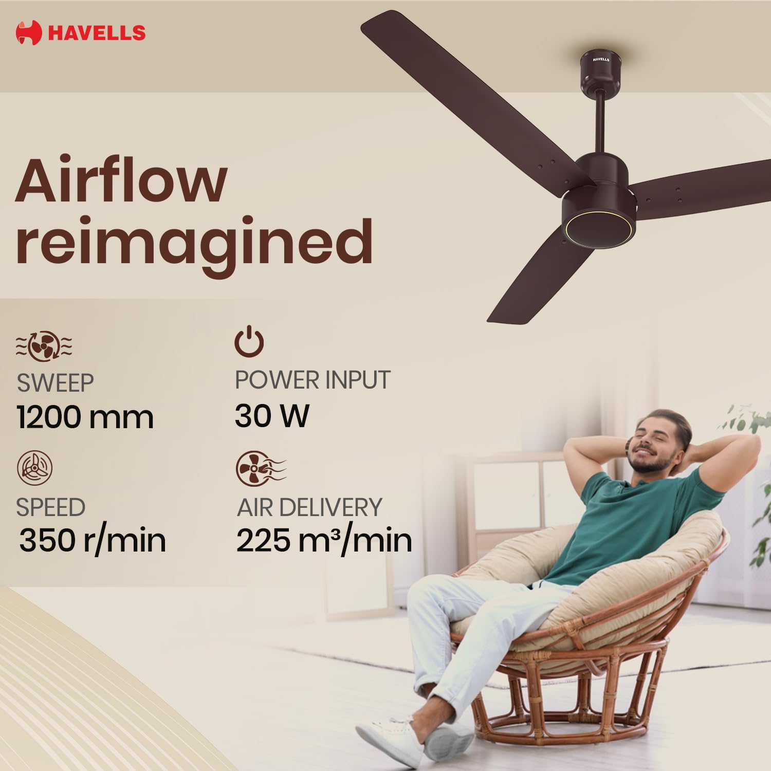 BUILT FOR LASTING PERFORMANCE : Havells Fab BLDC delivers 225 CMM air for powerful, even airflow. With reverse mode for winter, a timer function, Low noise levels, it ensures quiet, versatile comfort—perfect for modern, energy-efficient homes.