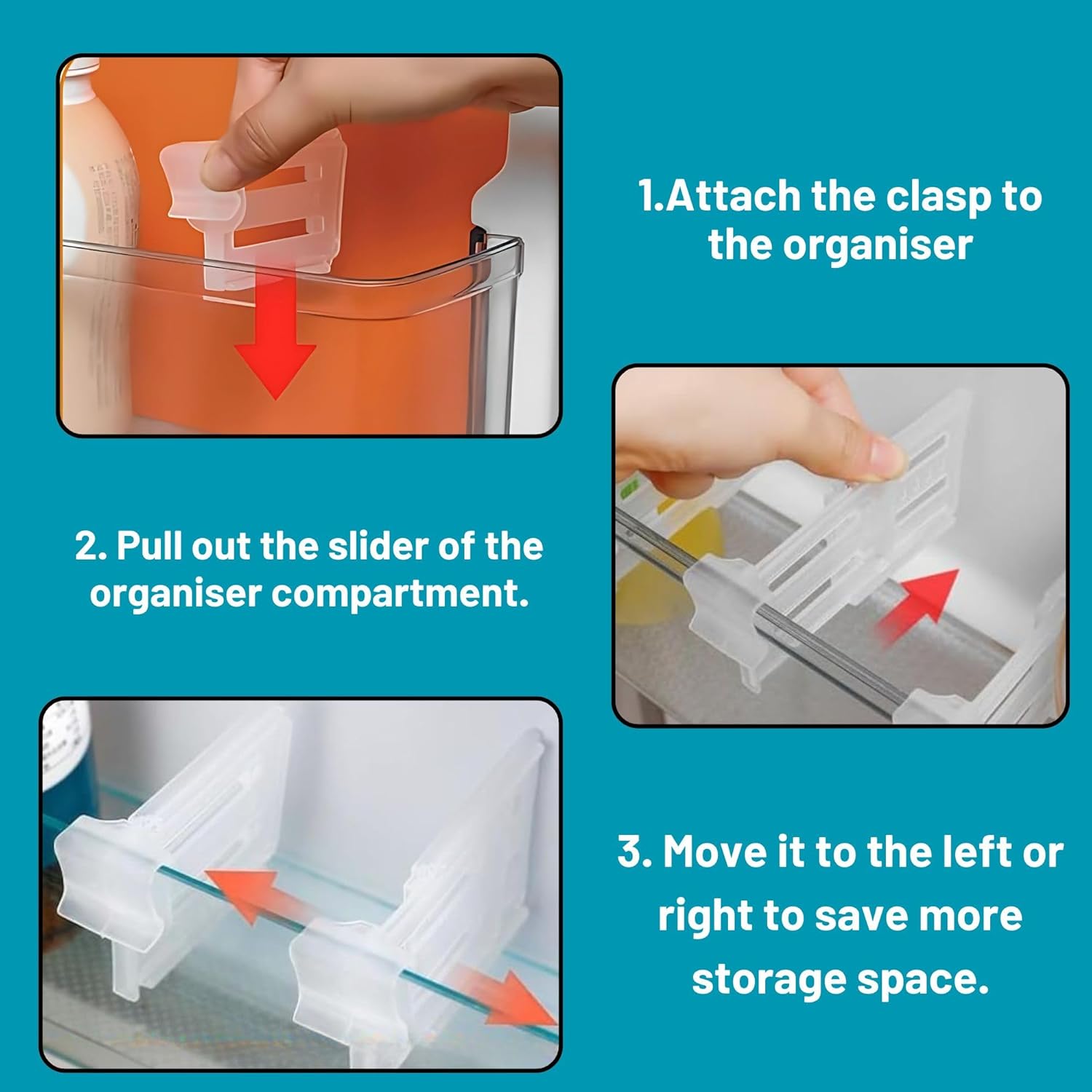 Expandable and movable fridge divider clips that adjust easily for flexible, customizable organization of bottles, snacks, and more in your fridge.