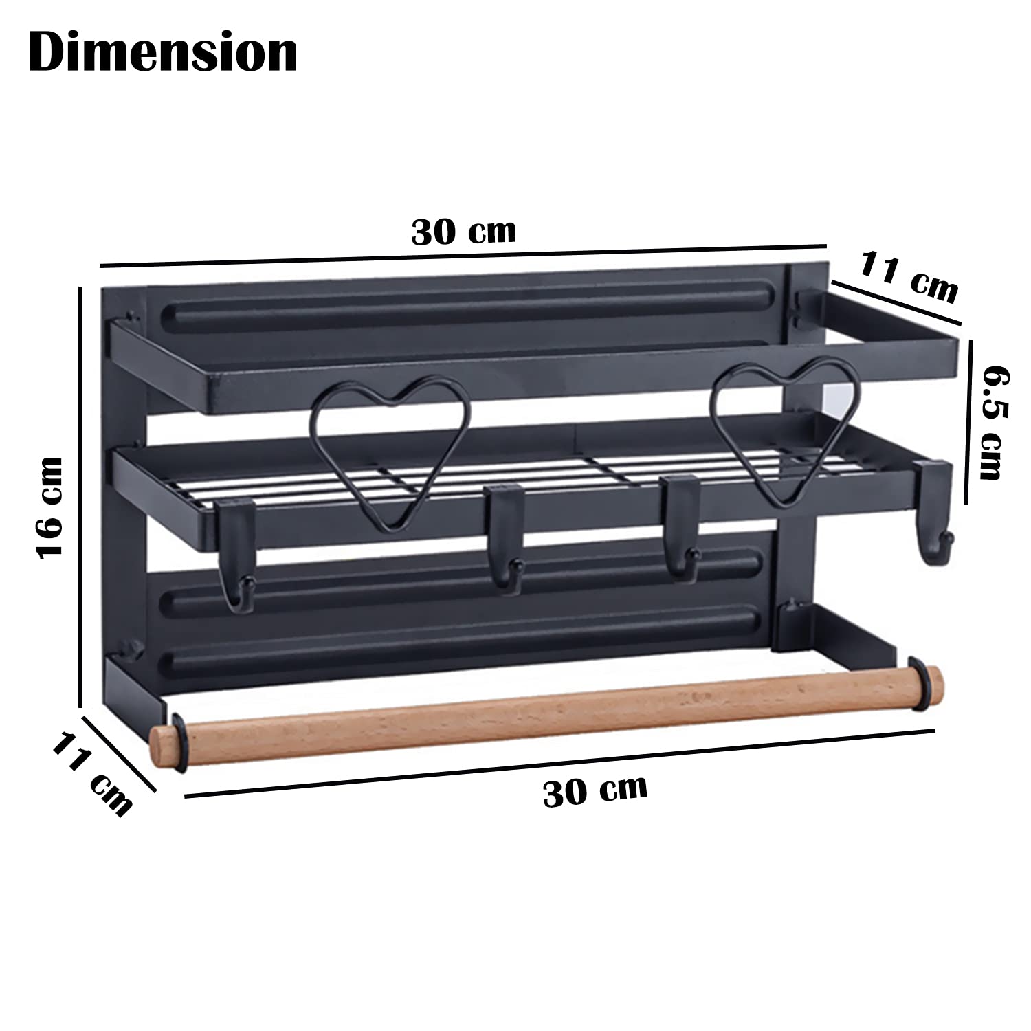 Dimensions – This magnetic shelf for kitchen measures 30 cm in Length 11 cm in Width and 16 cm in Height . What a great organizational tool! PACKAGE CONTENTS – 1 Magnetic Spice Rack Organizer Shelf for Fridge with Towel Napkin Holder and 4 Hooks.