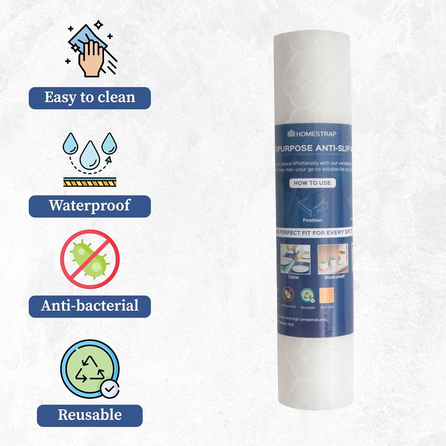 Introducing the Homestrap Anti-Slip Shelf Mat ? your ultimate solution for organized and stylish storage. Made from high-quality EVA material, this multipurpose liner is designed to withstand daily use while keeping your kitchen, wardrobe, and drawers organized and clutter-free. Its anti-slip surface provides a secure grip, ensuring that your items remain in place and reducing the risk of accidents. The waterproof design means you don?t have to worry about spills or moisture damaging your surfaces. Keeping your shelves hygienic is simple?just wipe or rinse the mat as needed. This shelf liner adds a modern touch to your home decor and can be used beyond the kitchen in wardrobes, fridges, and trolleys. The Homestrap Anti-Slip Shelf Mat is not just practical; it?s stylish and customizable. Easily cut the mat to fit any space, providing a perfect fit for all your storage needs. Trust Homestrap to deliver quality and functionality, keeping your belongings safe and organized.
