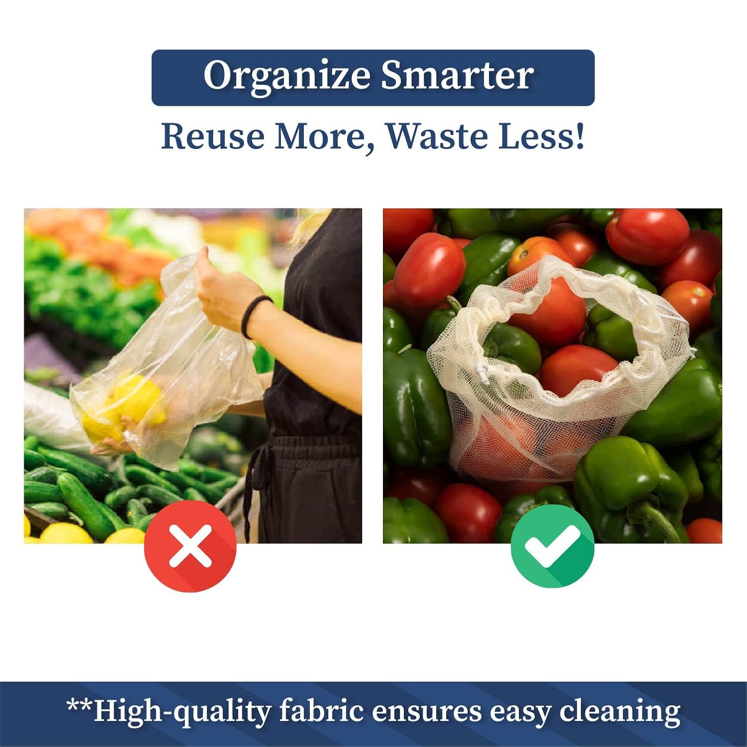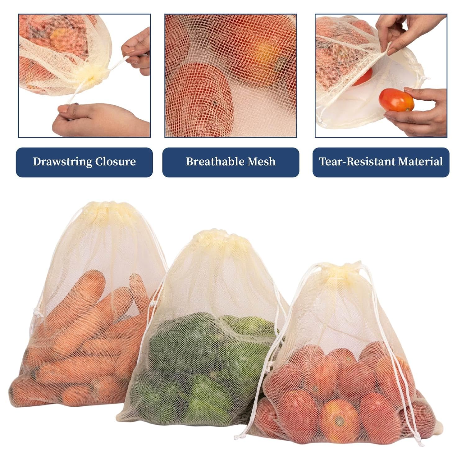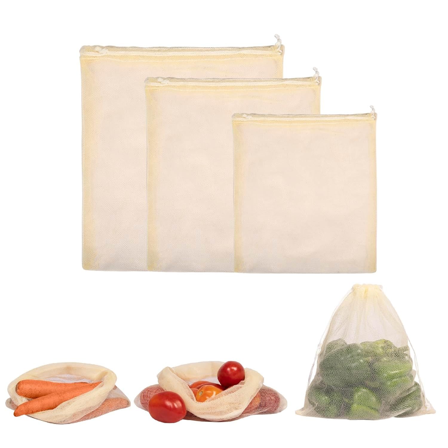 BREATHABLE & DURABLE MATERIAL: Made from tear-resistant mesh, these bags ensure proper airflow to keep vegetables fresher longer. The convenient drawstring closure offers a reusable alternative option for ziplock bags.