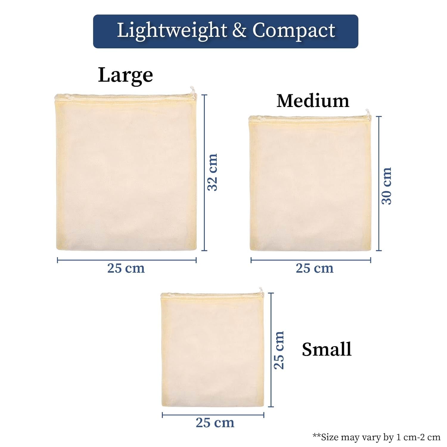 Received today.First look after opening the packet was pleasing : The white nice storing pouches/bags.Bags quality looks good. String system for closing n opening other than the zips seems more promising for their longer life span.Attached are the pics showing the sizes. (As 4+4+4=12 pieces) are there.Though the difference between the gradual increase in size between first two sizes AND between the last two sizes is hardly noticeable.:) It is barely visible only between the 1st n the 3rd sized bags.Have also shared another pic too after placing the fruits n vegies in them. You can clearly have the idea about their sizes with that.I purchased them ..mainly for my fridge purposes but found these can be used as multipurpose bags also. :)Material..is said and seems to be washable.Will definitely spread the word to my mom n m.i.l. :))Seems value for money..