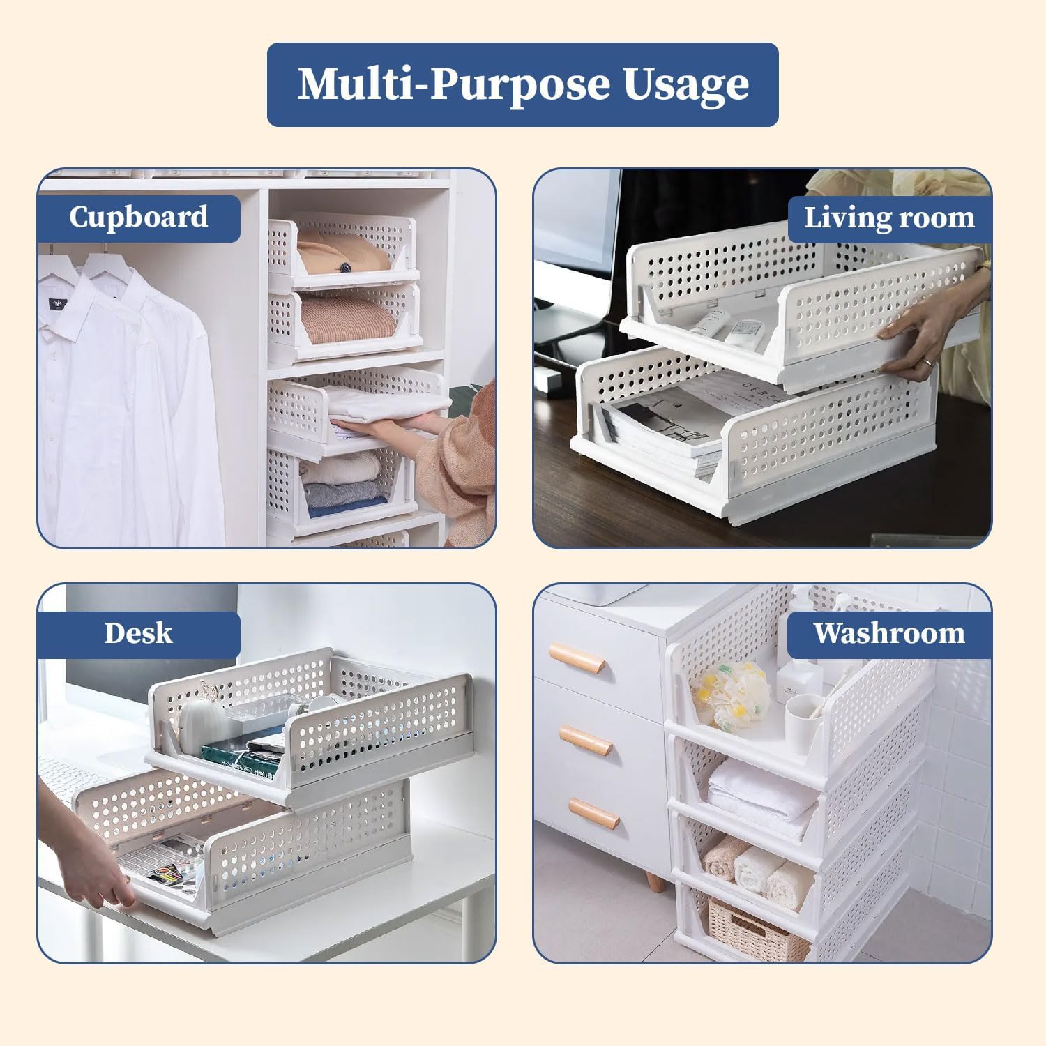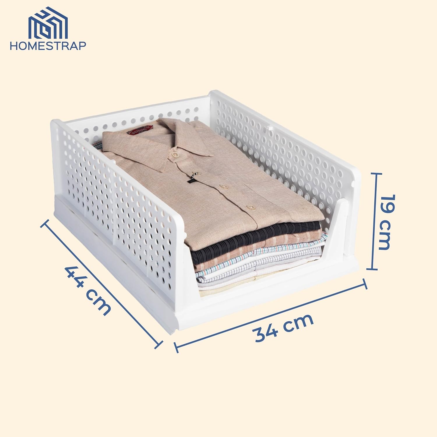 HomeStrap Set of 6, Stack it Up | Large Cloth Stacker | Foldable Shirt Storage Stacker for Wardrobe | Plastic Stackable Closet Organizer | White | 34L x 44W x 19H Centimeters