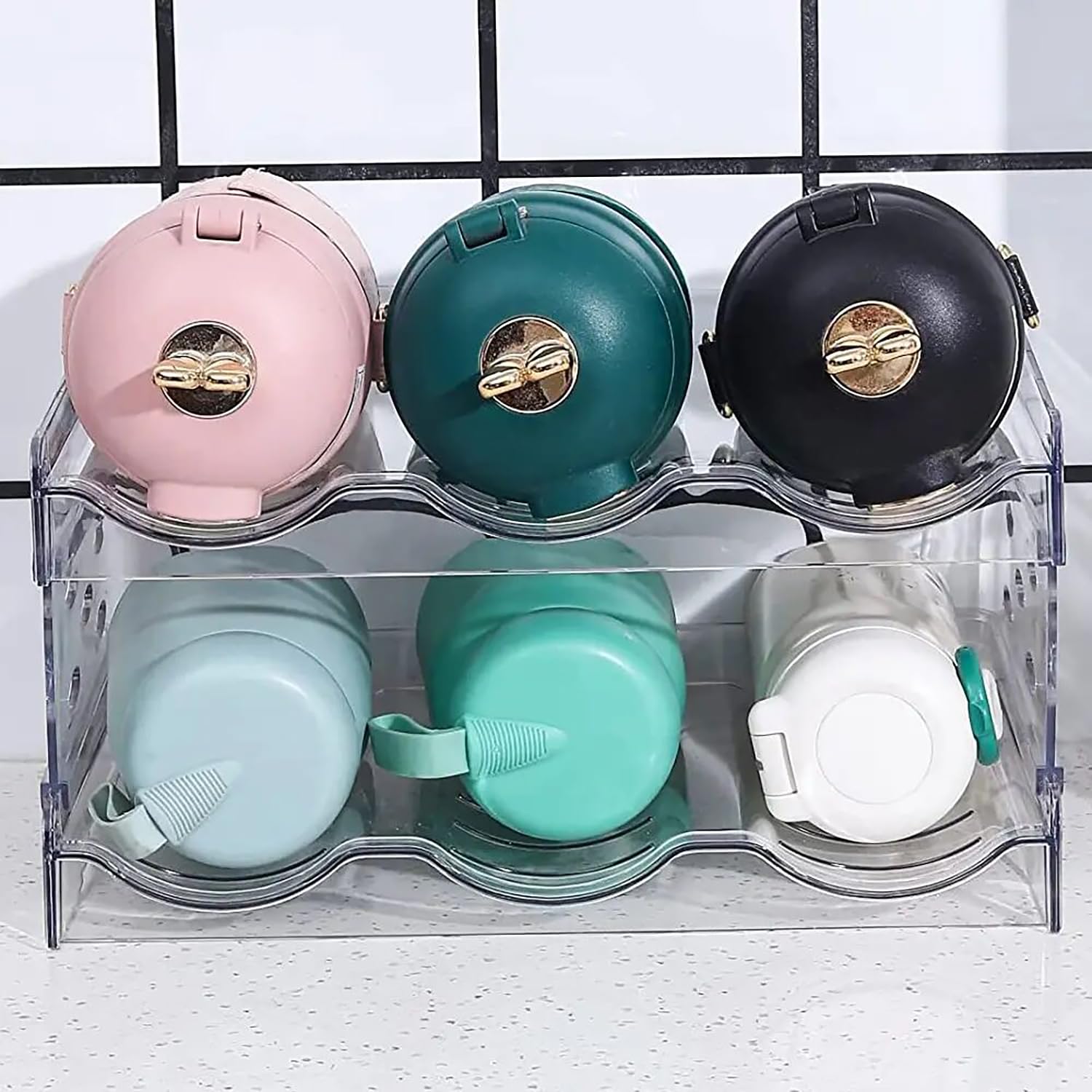 2-Layer Stackable Design: With two stackable layers and three bottle slots per tier, this rack is ideal for holding water bottles, thermoses, or sports bottles in a neat and organized way.