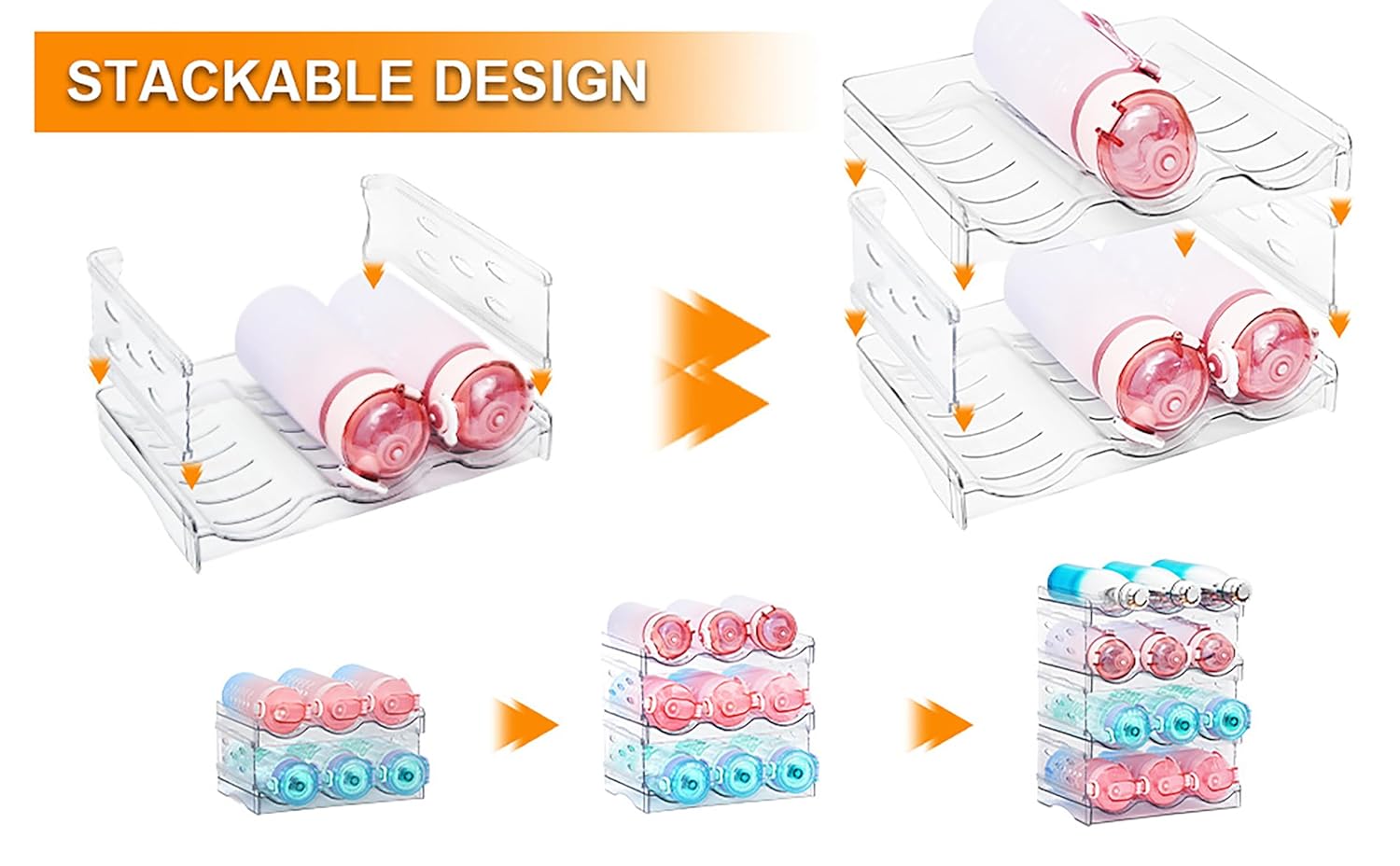 Maximize your kitchen or fridge storage space with the House of Quirk Clear Plastic Bottle Rack, designed for easy organization and accessibility. This 2-layer stackable bottle organizer comes with 3 slots on each tier, providing ample room for your favorite water bottles, tumblers, or drink containers. The compact design makes it a perfect fit for kitchen cabinets, fridges, or countertops.