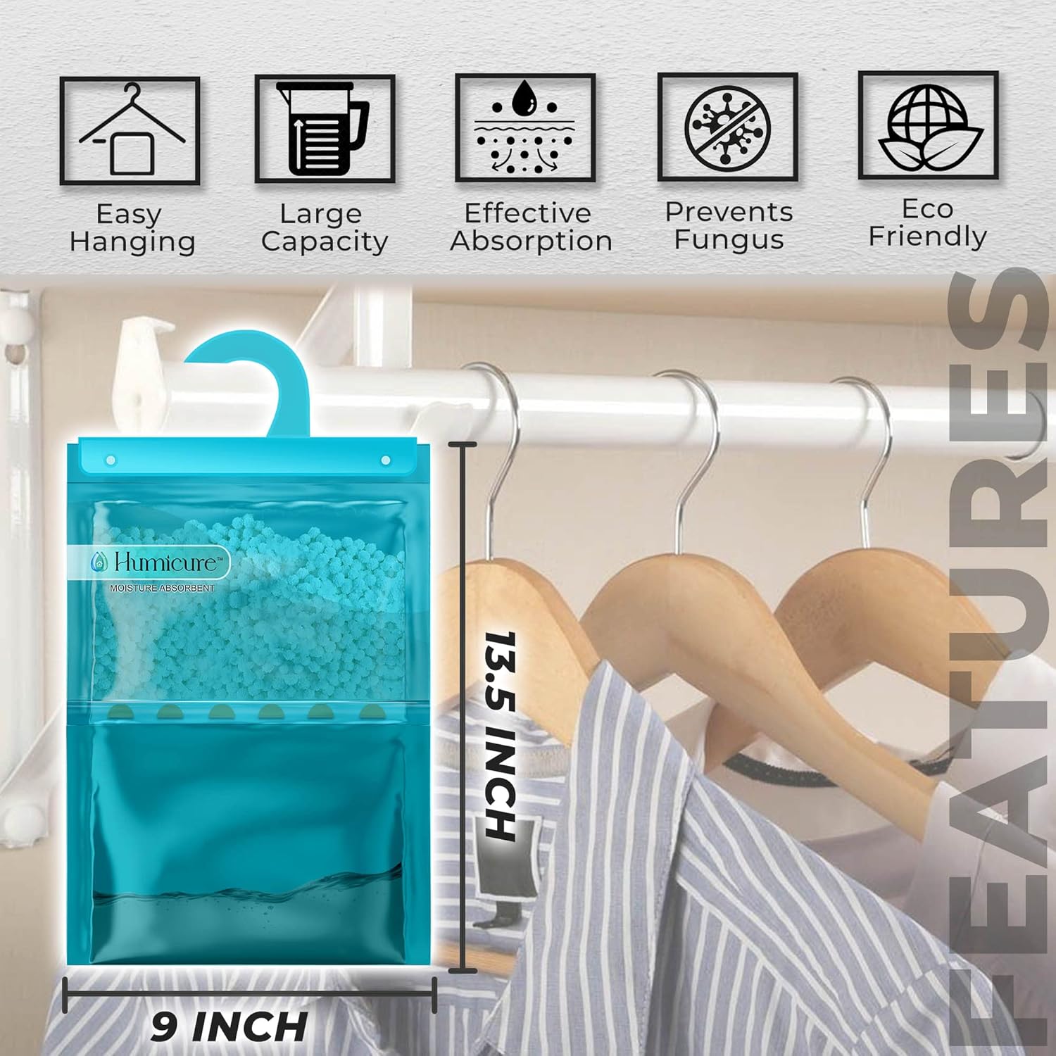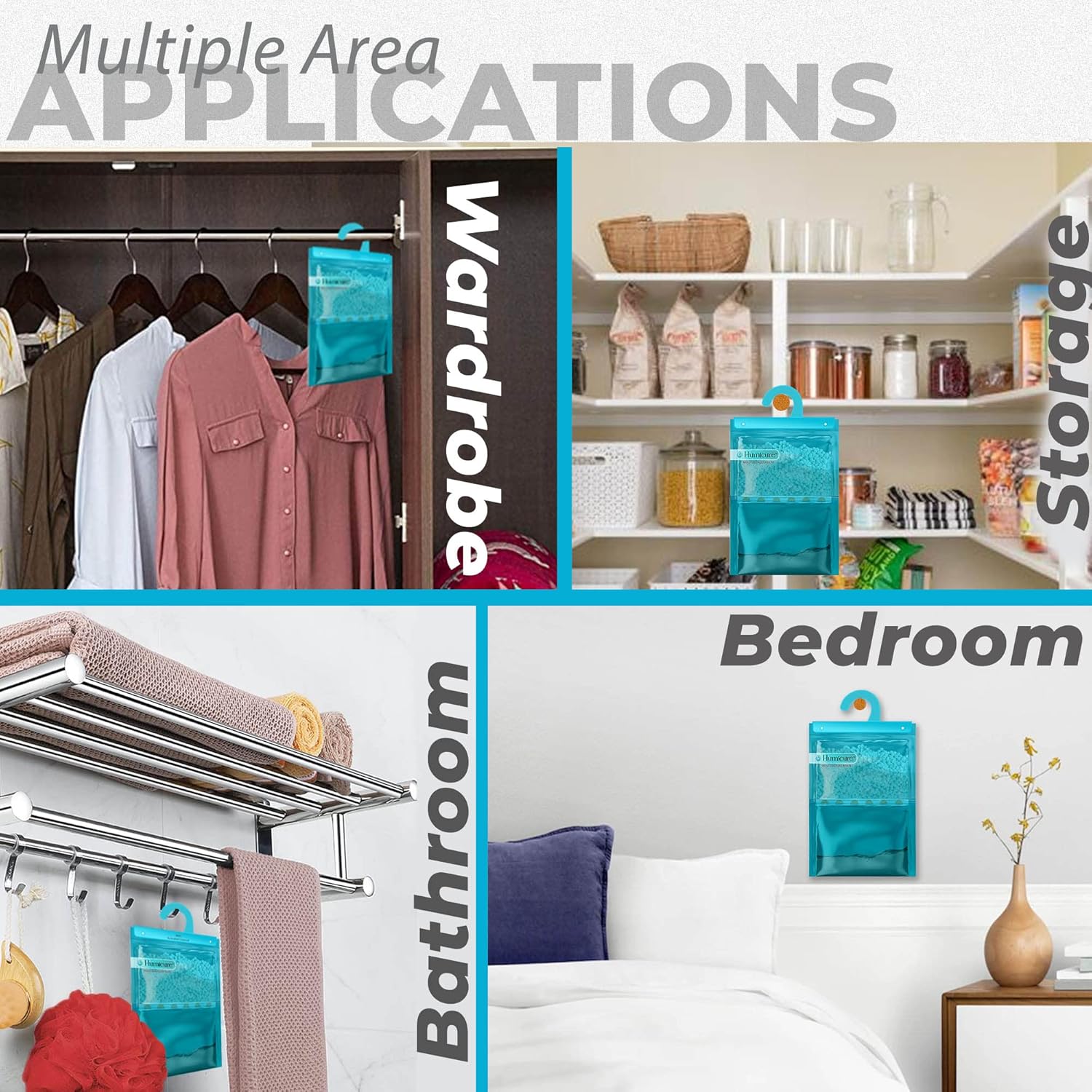 WIDE AREA USAGE: Humicure moisture absorber bags are designed to hang in closets and all other enclosed storage spaces. Suitable for closets, basements, cabins, bathrooms, garages, Kitchen, laundry rooms, and other enclosed spaces.