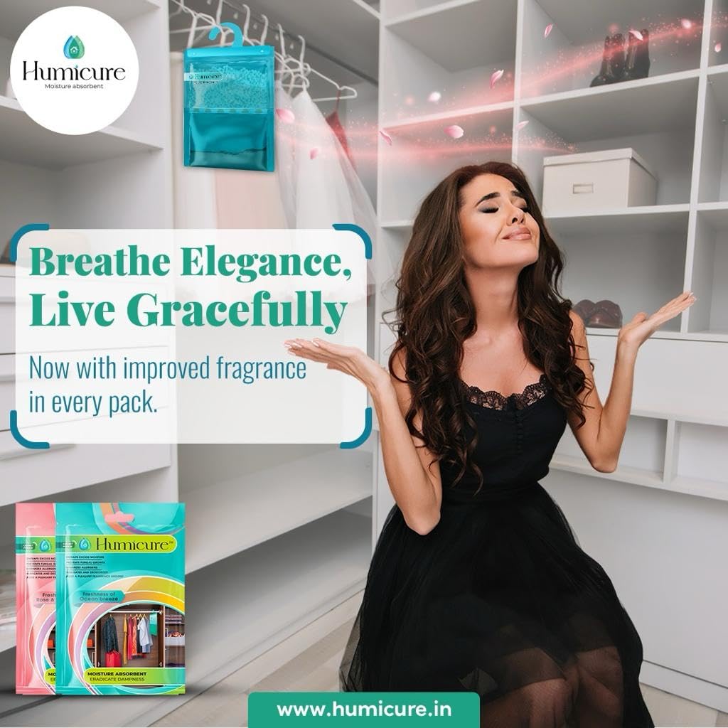 Humicure Moisture Absorber Dehumidifier Hanging Bags with 1 Litre Absorption Capacity for Wardrobe, Bathroom, Kitchen and Bedroom; Prevents Mould & Fungus (Pack of 3, 400gram each, 3 Fragrance Combo)