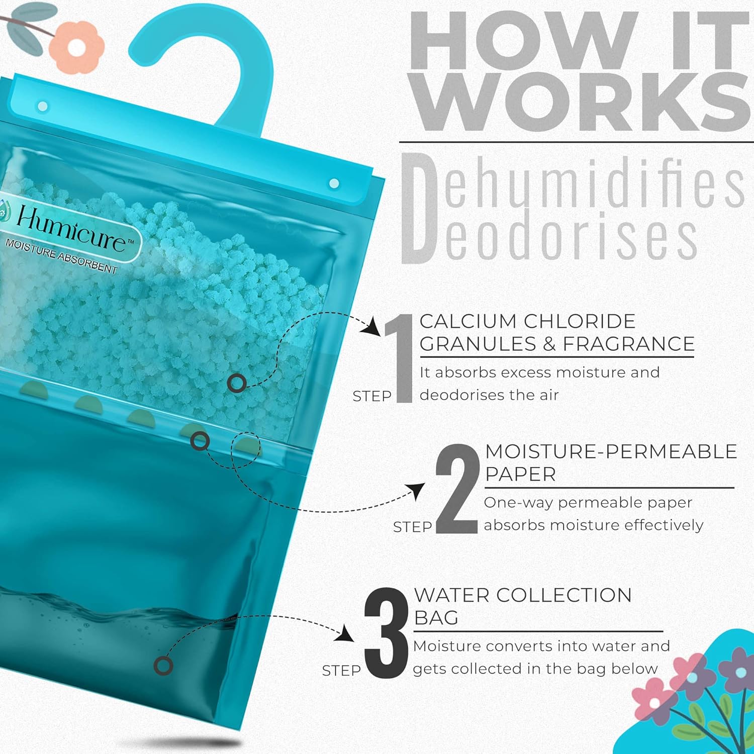 ABSORBS EXCESS MOISTURE: Humicure dehumidifier bag features calcium chloride particles that entraps and absorbs excess moisture and prevents fungal growth. It fumigates and aerates the atmosphere and deodorize closed spaces.