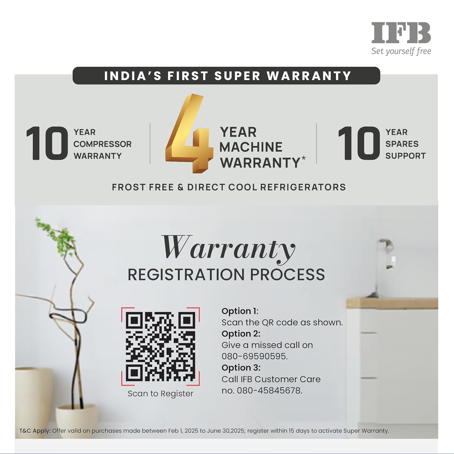 IFB Super Warranty: India’s First & Only! Enjoy 4 years of machine warranty, 10 years of compressor warranty, and 10 years of spare parts support.