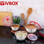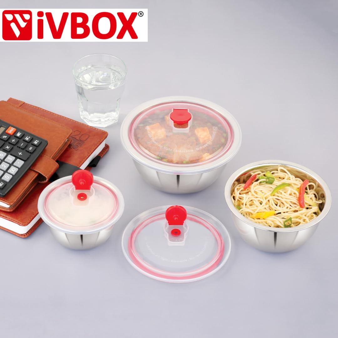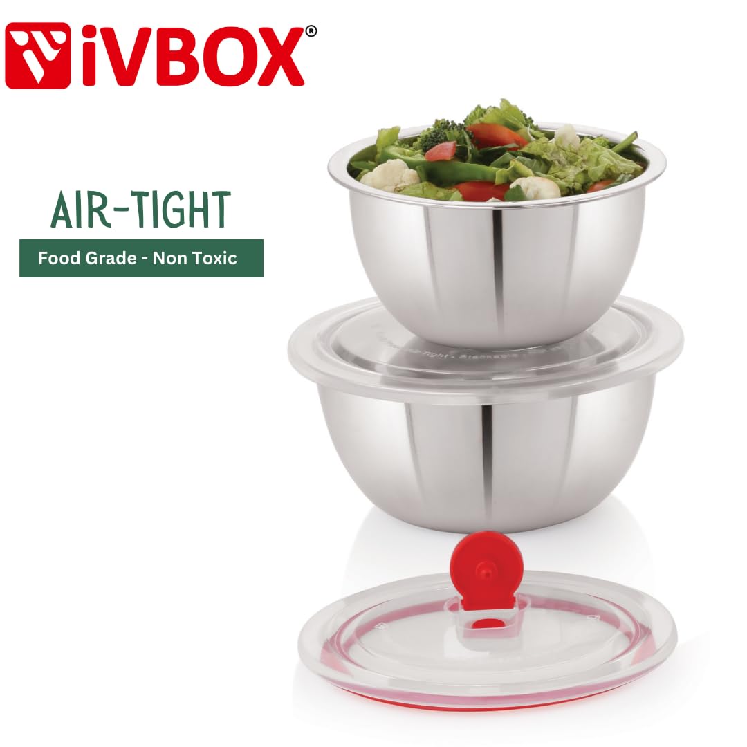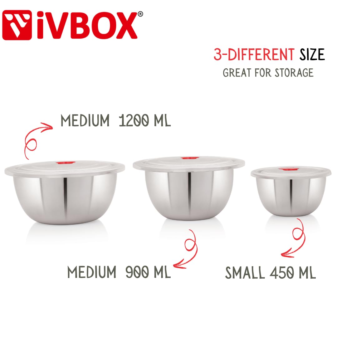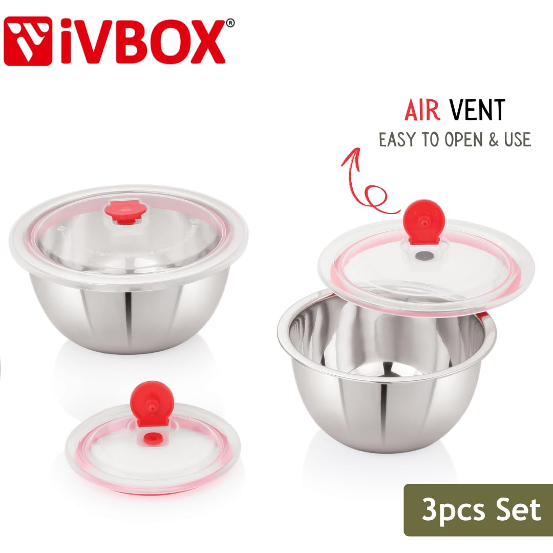 ivbox Stainless Steel Air-Tight Fridge Storage Containers Pack of 3, Food Organiser Bowl with Air Vent, Fridge Storage Boxes Keep Fruits, Vegetables Fresher, Container Box, 450ml, 900ml & 1200ml