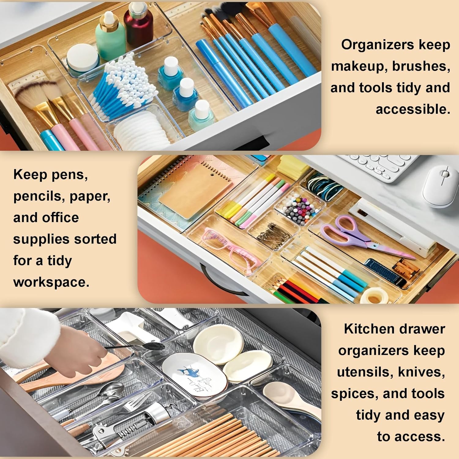 𝐄𝐟𝐟𝐨𝐫𝐭𝐥𝐞𝐬𝐬 𝐄𝐟𝐟𝐢𝐜𝐢𝐞𝐧𝐜𝐲: This Clear drawer organizers make it easy to find and access your items quickly. Keep your drawers tidy with minimal effort, saving time and embracing a clutter-free lifestyle.