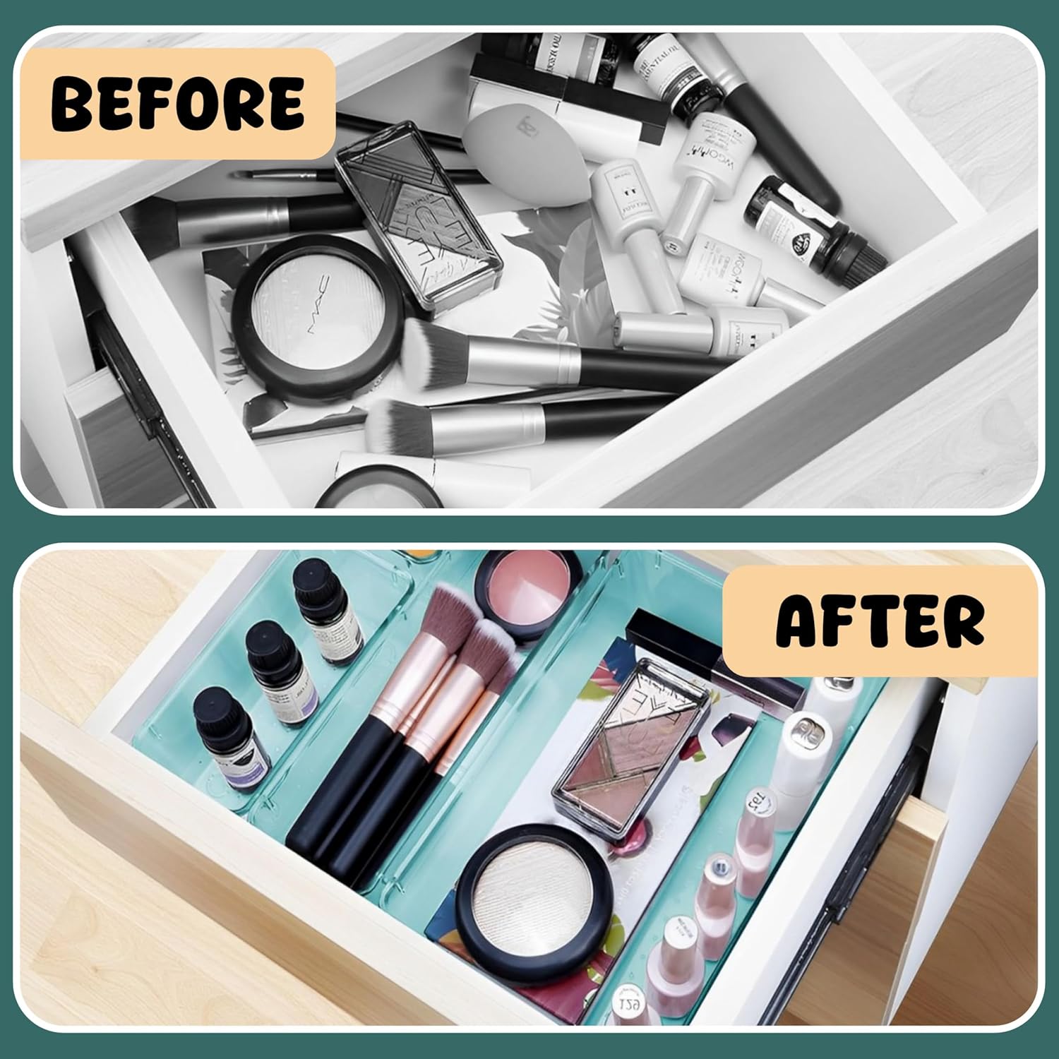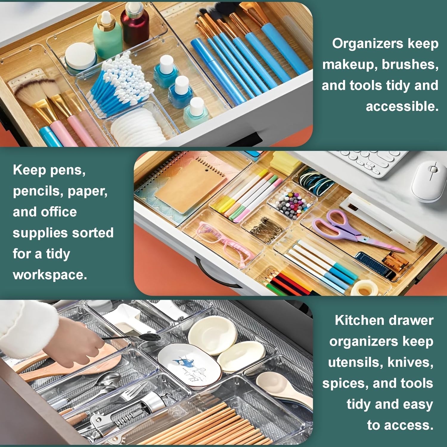 𝐄𝐟𝐟𝐨𝐫𝐭𝐥𝐞𝐬𝐬 𝐄𝐟𝐟𝐢𝐜𝐢𝐞𝐧𝐜𝐲: This Clear drawer organizers make it easy to find and access your items quickly. Keep your drawers tidy with minimal effort, saving time and embracing a clutter-free lifestyle.