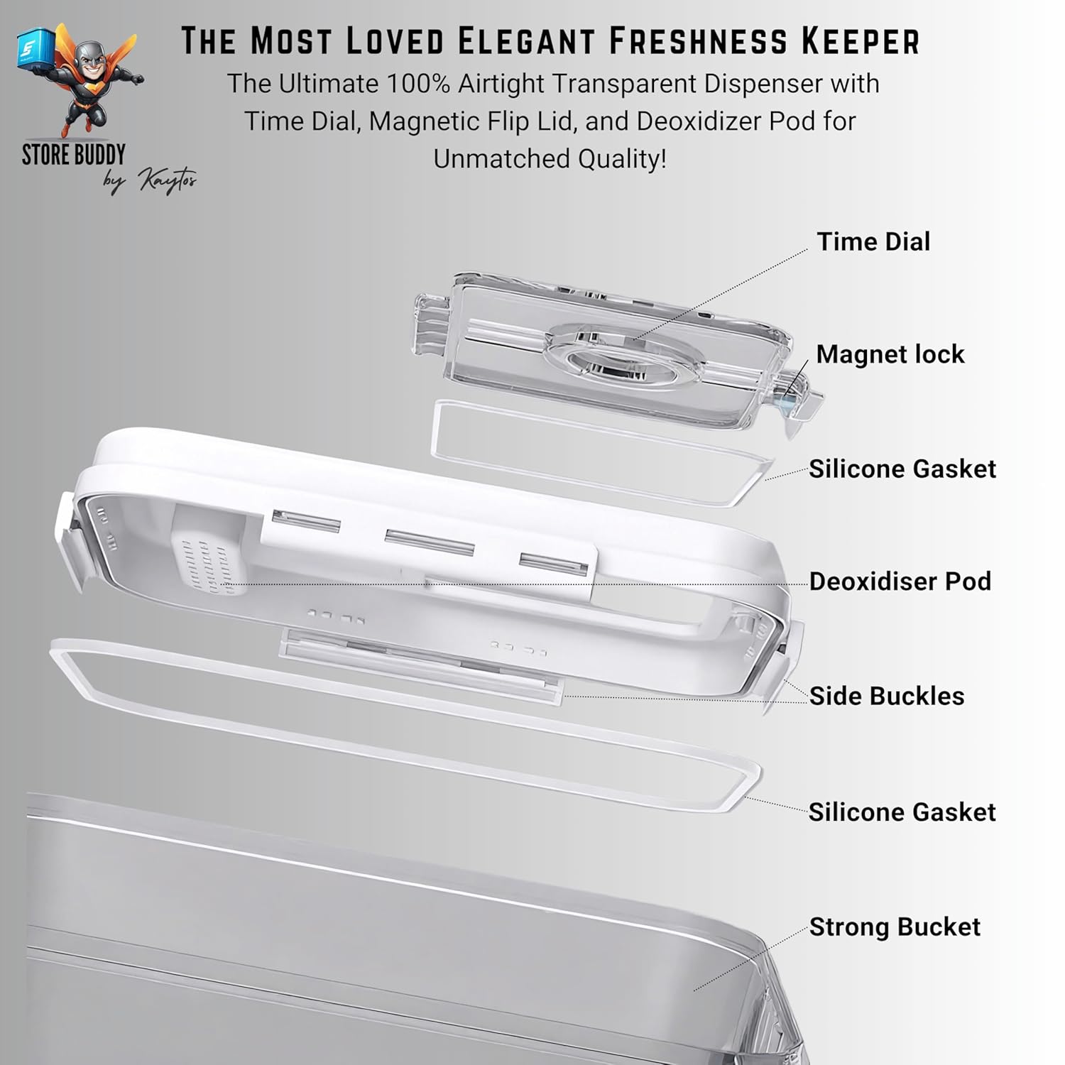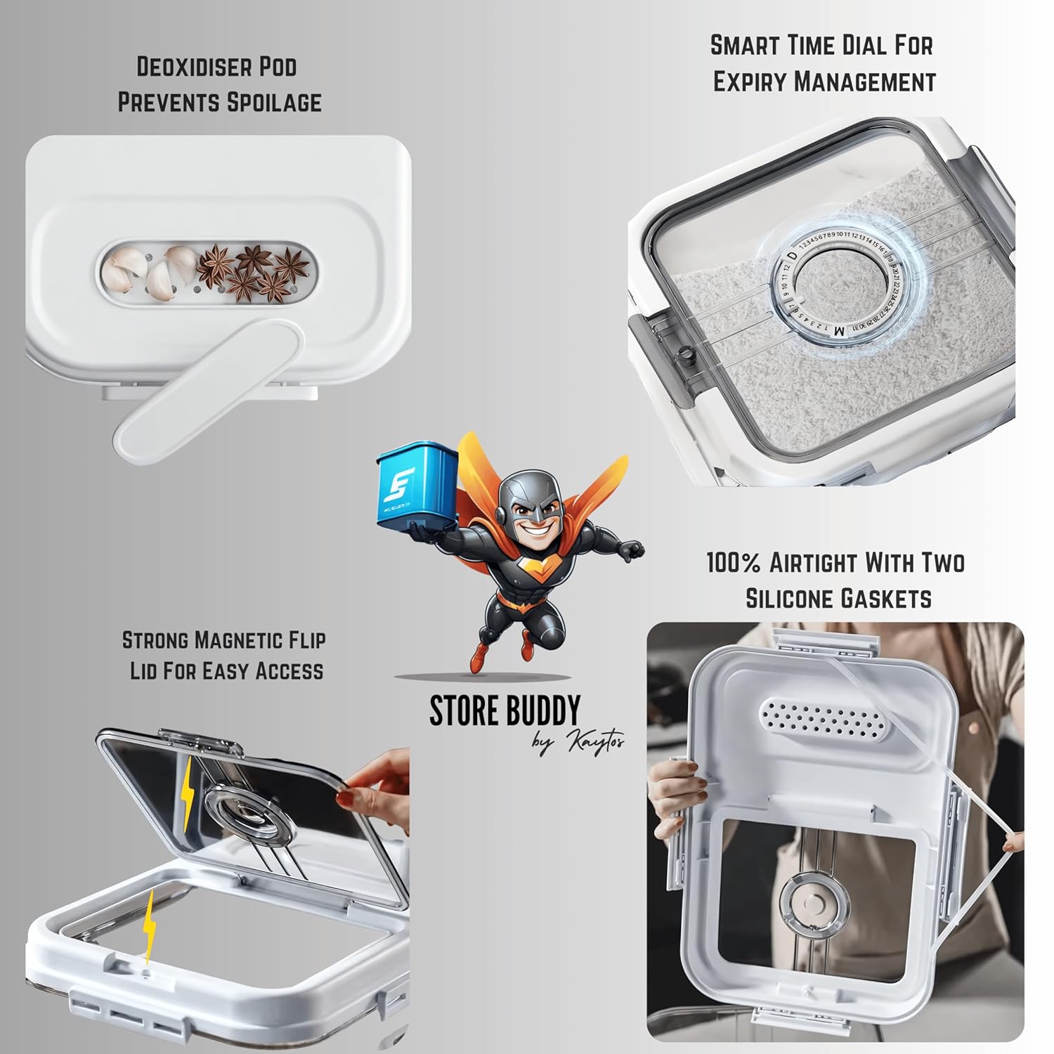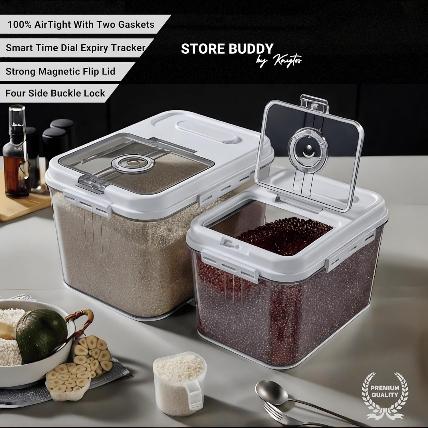 PRECISION LOCK & AIRTIGHT MAGNETIC FLIP LID – Our unique lock closure system ensures a precise, 100% airtight seal with two silicone gaskets, keeping your food fresh and safe. Perfect for rice, atta, sugar & spices without worrying about air leaks