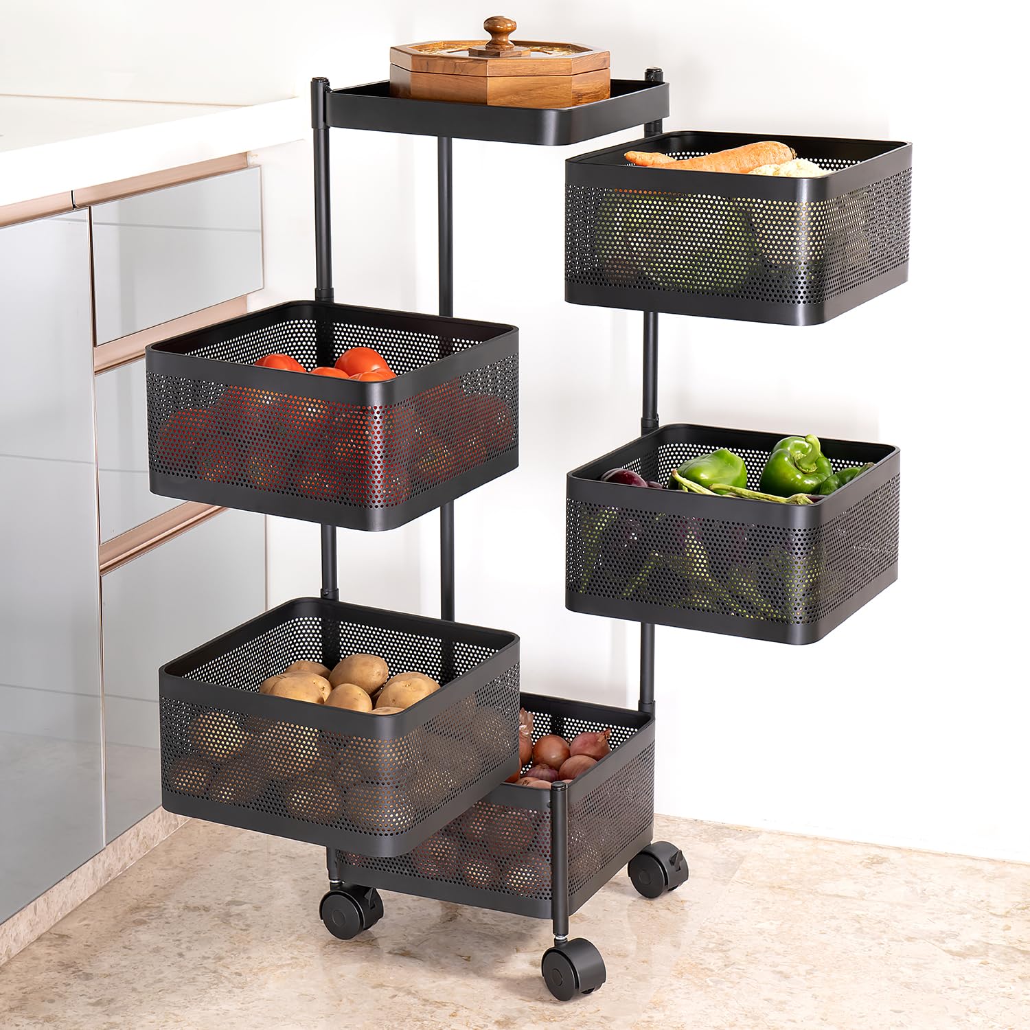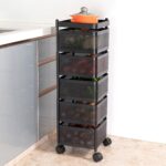 Kitchenwell Metal Multi-Purpose Trolley Storage Organizer and Kitchen Accessories Items for Kitchen Storage Rack Square Design Fruits & Vegetable Onion Cutlery (Matt Black, 5 Layer Drawer)