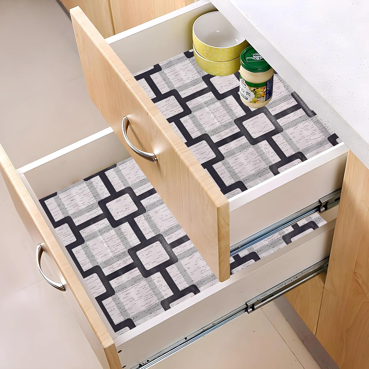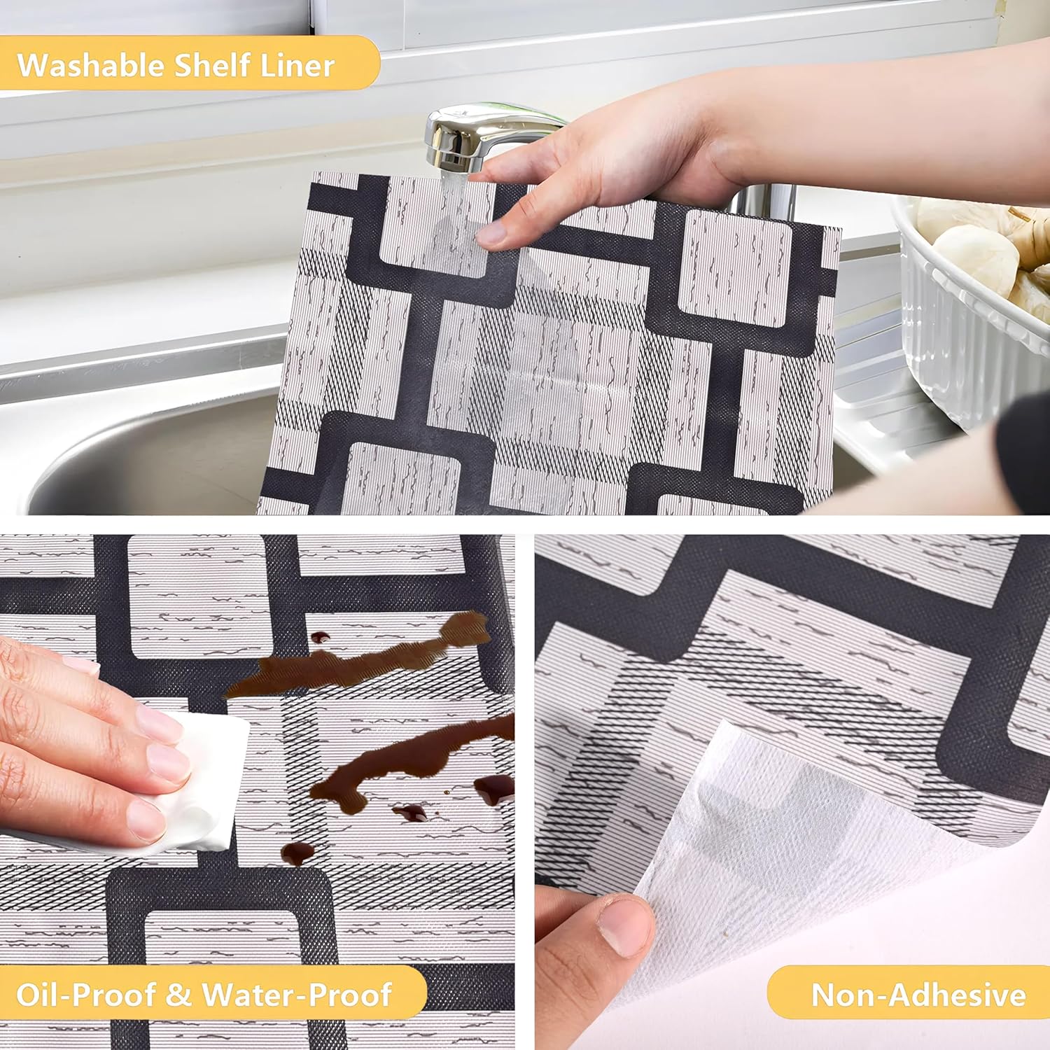 Waterproof and Easy to Clean—The kitchen cabinet liners are waterproof which keep your cabinet, drawer, wardrobe,refrigerator from slimy, greasy. The non-adhesive shelf liners can be easily removed from your cabinets and cleaned with mild soap and a damp cloth or sponge, so you can keep them looking clean day after day.