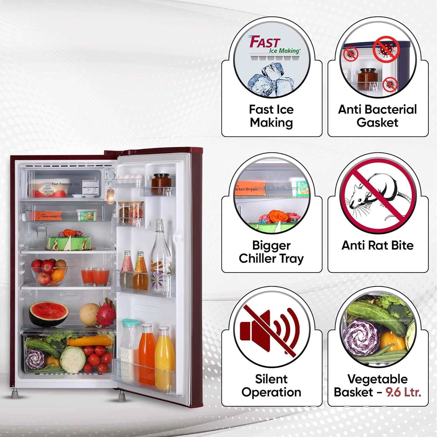 Special Features: Adjustable shelves; Door Lock; Temperature control; Stabilizer free operation (90~310V); Quick cooling zone for dairy products; Interior refrigerator light