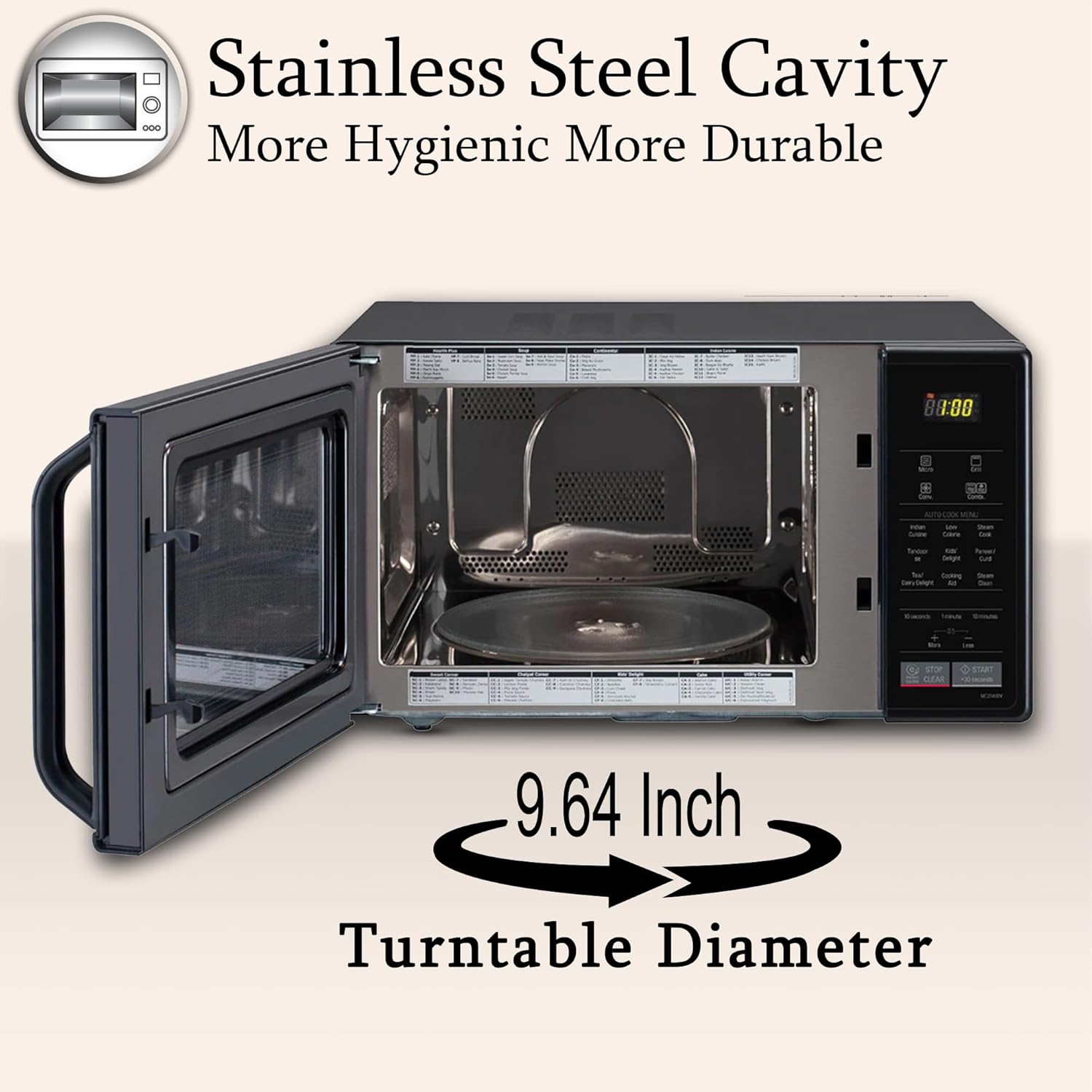 Dimensions of outer body, inner cavity and turntable diameter – 47.5 CM X 28.5 CM X 46 CM (W X H X D) | Inner cavity – Stainless Steel | Turntable Diameter – 9.64 Inches