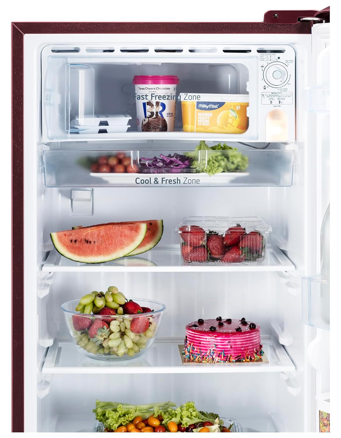 (maximum in its class). A spacious 21 L vegetable box (removable) keeps produce fresh, while the antibacterial gasket ensures hygiene. It also includes an ice tray, 02 L bottle storage, and a base stand with drawer for dry storage