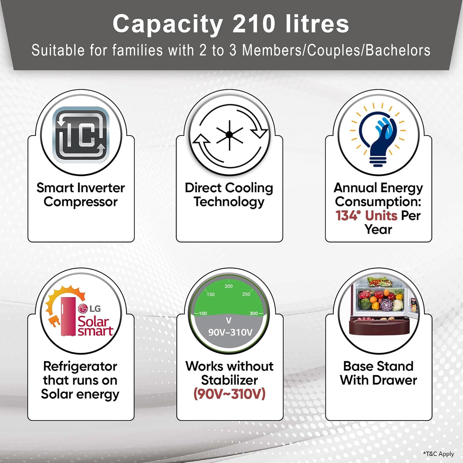 Capacity: 210 Liters – Suitable for families with 2 to 3 members / Bachelors / Couples | Freezer Capacity – 24 L; Fridge Capacity (Fresh food capacity) – 186 L