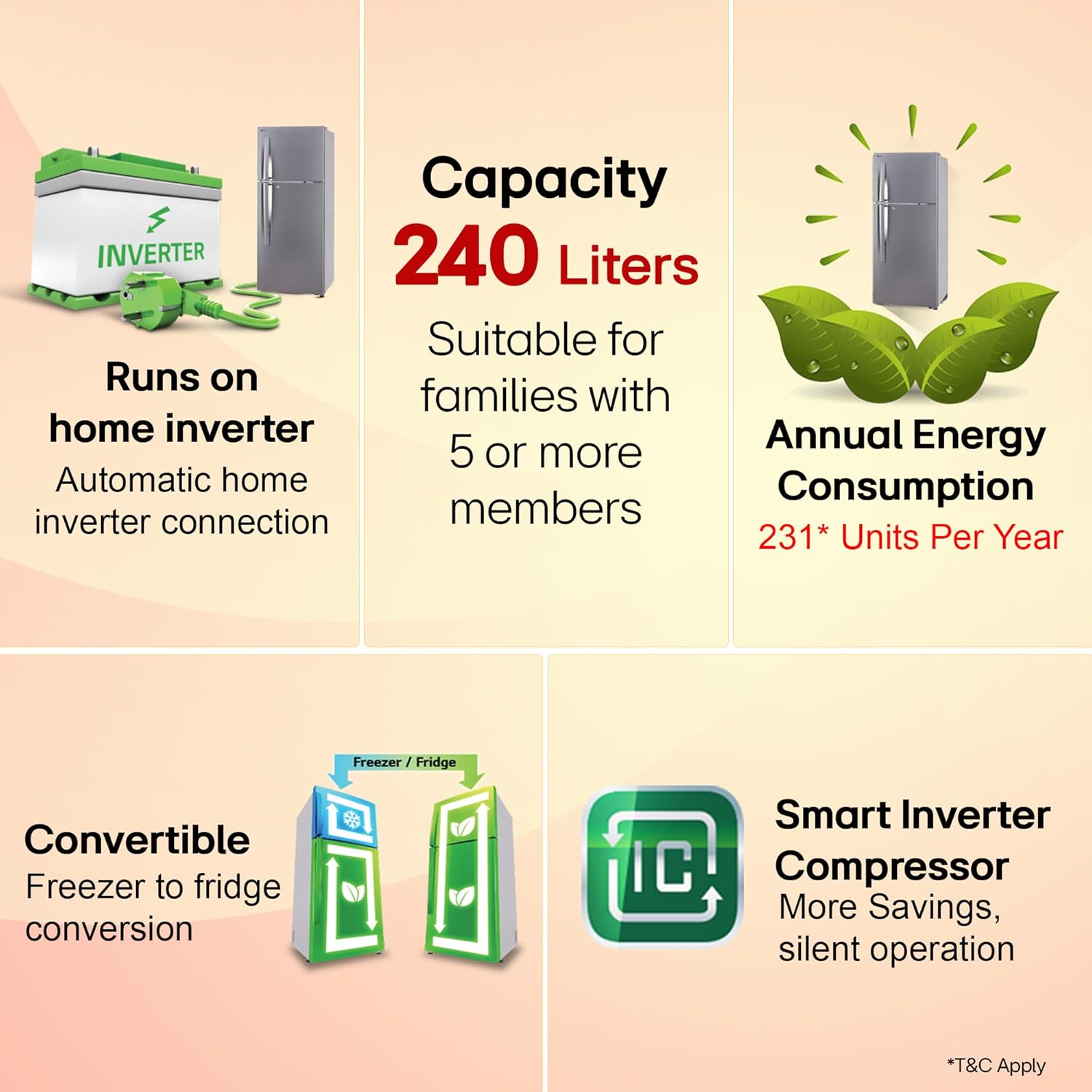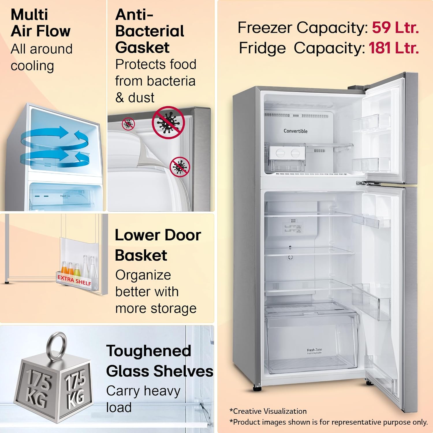 Capacity 240 ltrs: Suitable for families with 2 to 3 members I freezer capacity: 59 L; fresh food capacity (Fridge): 181 L