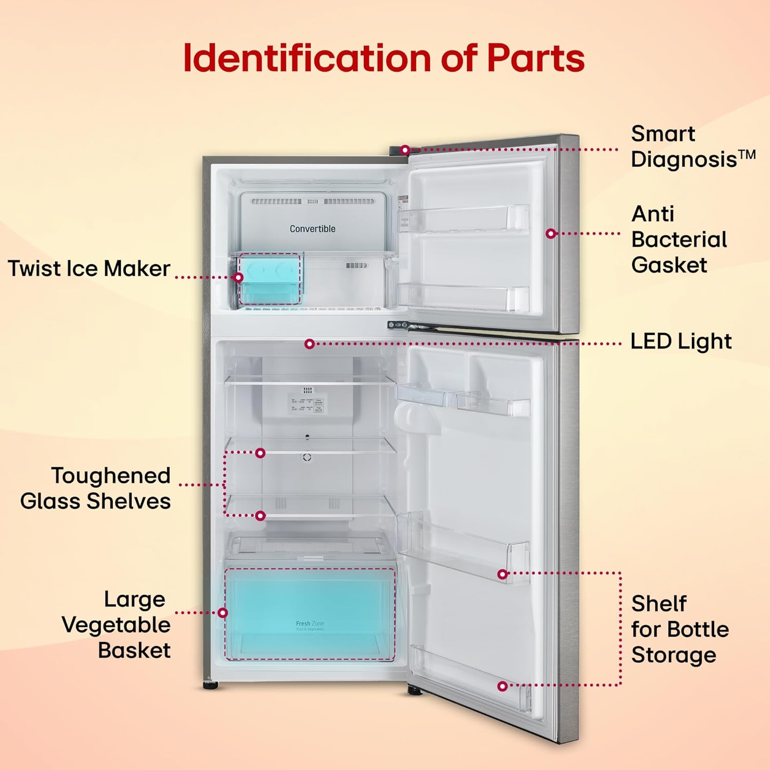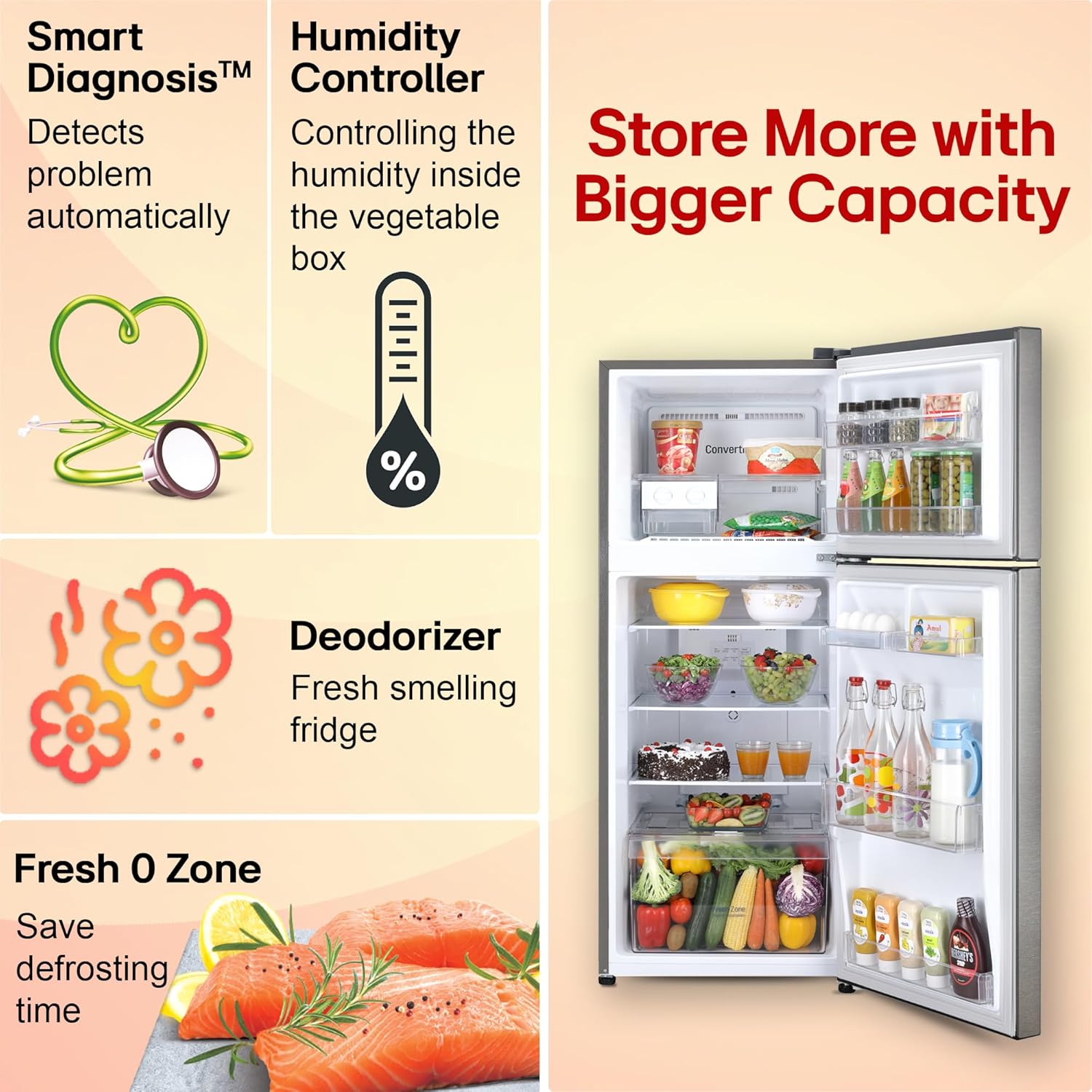 LG Exclusive Features: Convertible- to convert and control two compartments of the double door refrigerator & Offers you more space to suit your needs; Smart diagnosis- is a fast and easy way to troubleshoot issues; Smart Connect- helps connect your refrigerator to home inverter; Easy Slide Shelf
