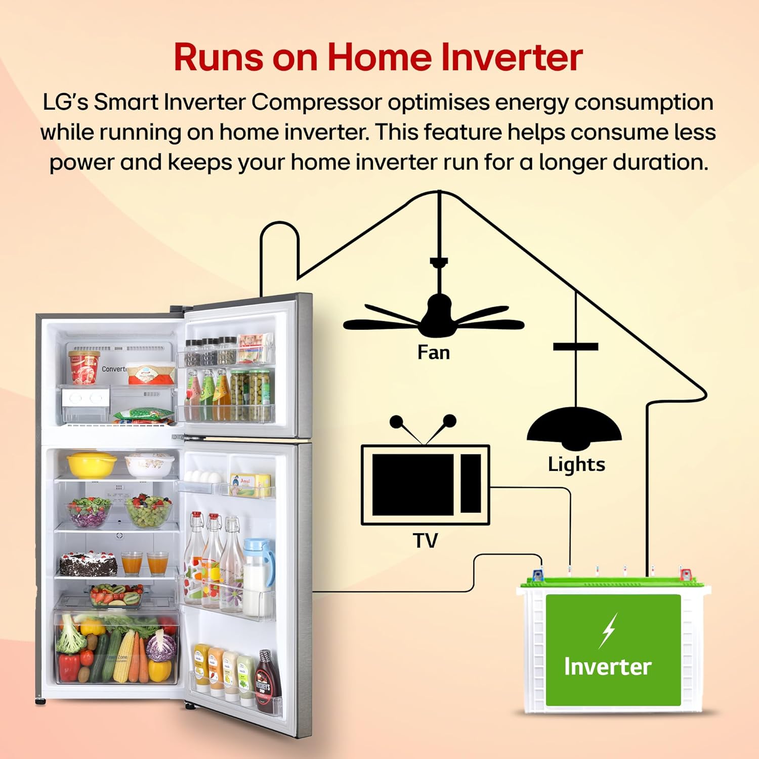Auto Smart Connect is a technology that helps connect your refrigerator to home inverter. Once the refrigerator is connected to the home inverter, every time the power goes off it automatically takes inverter power to run the refrigerator without any manual supervision.
