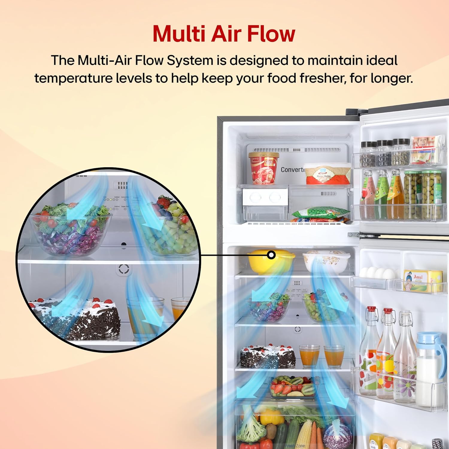 LG’s Multi Air Flow system ensures consistent cooling across every shelf with strategically placed vents, keeping your food fresher, longer, and evenly chilled every corner.