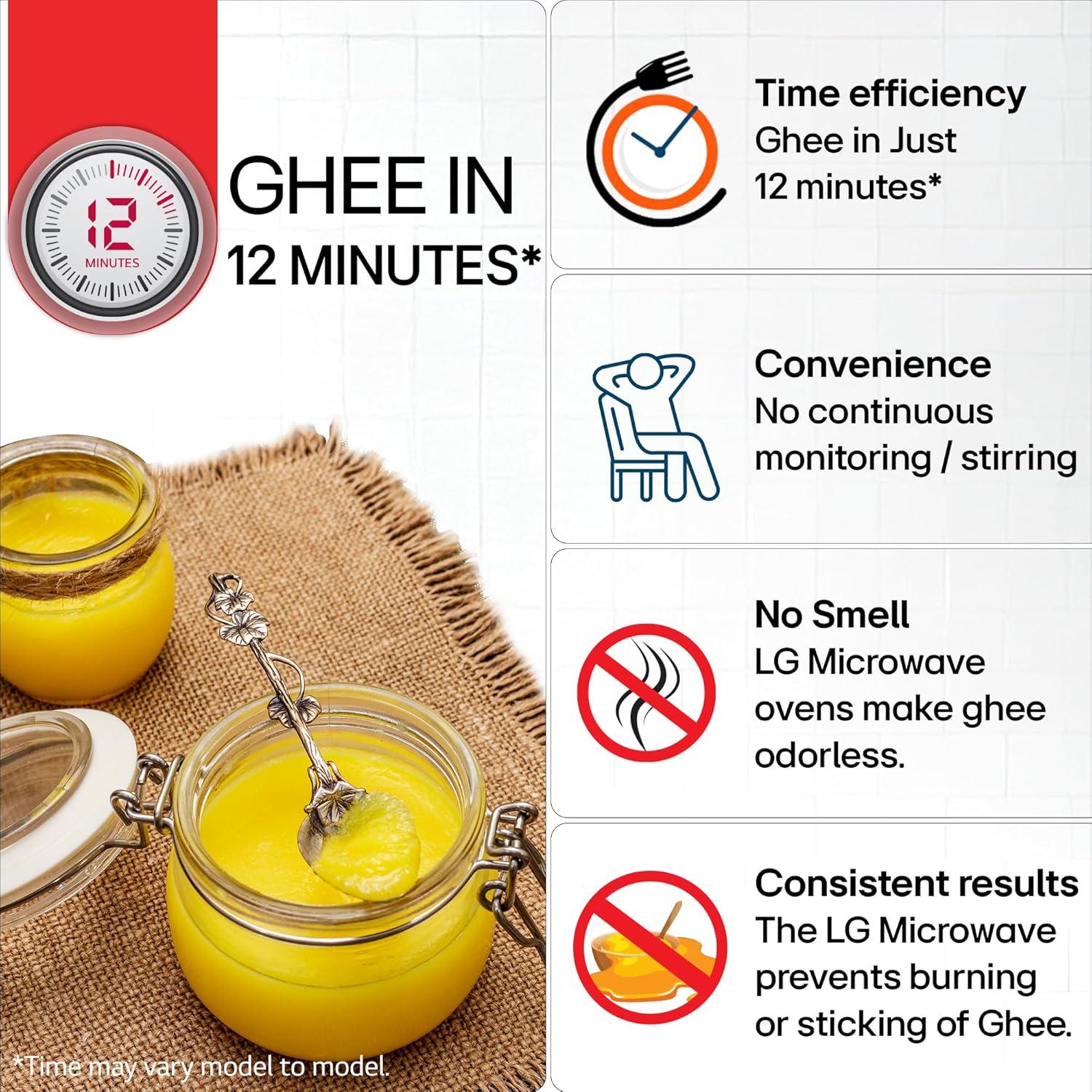 An LG convection microwave feature that allows you to make fresh, homemade, and hygienic ghee in just 12 minutes, eliminating the mess and lingering odor of traditional stovetop methods.