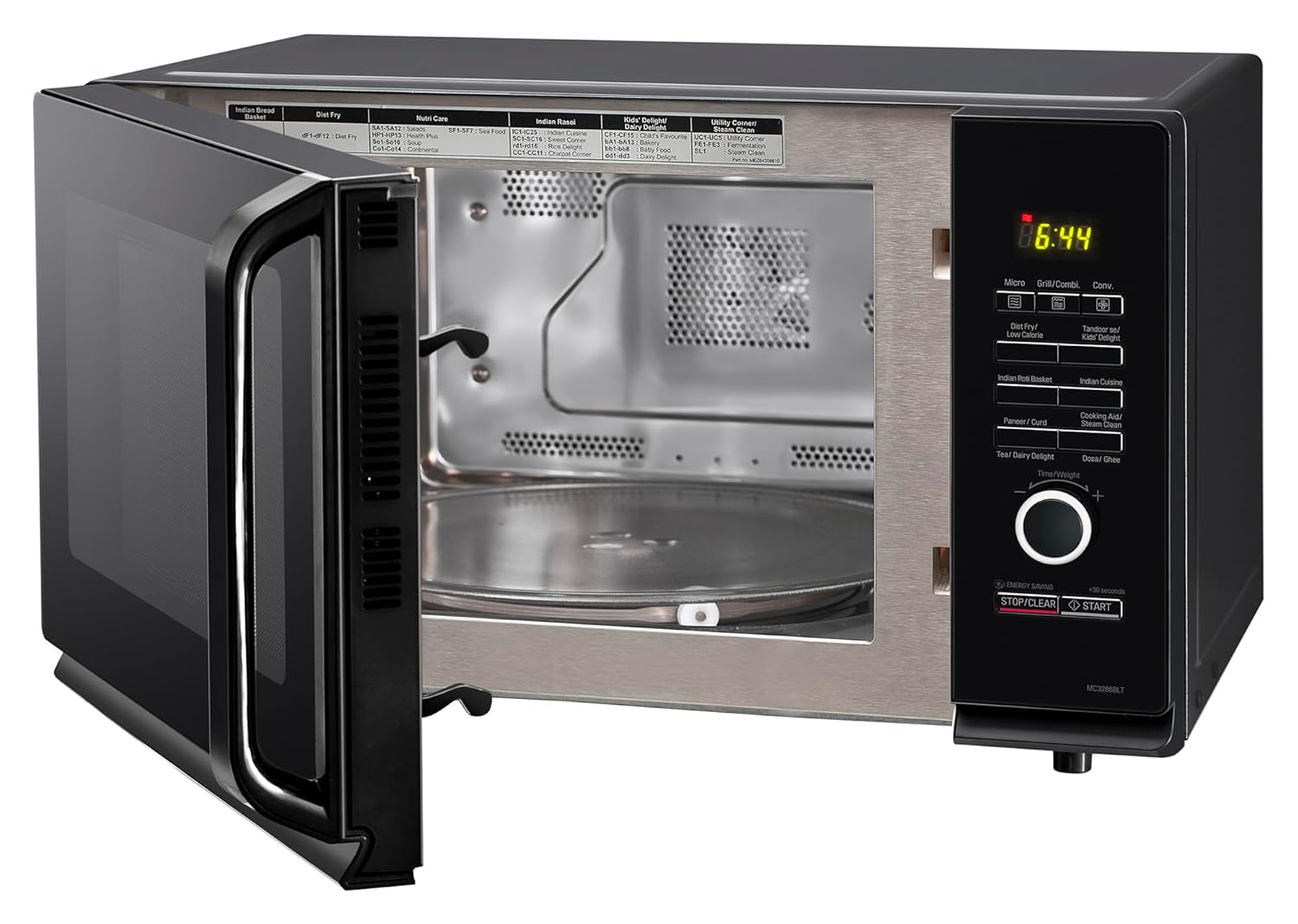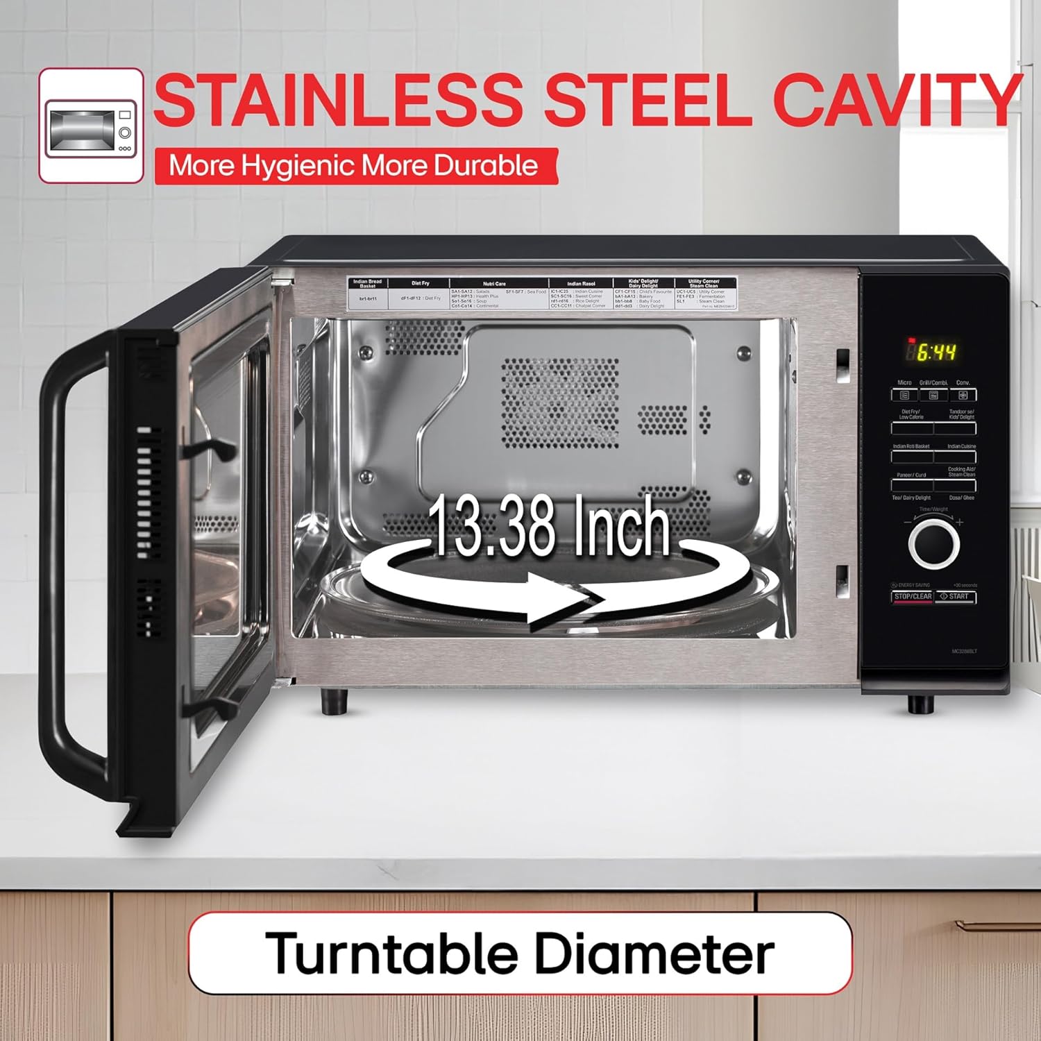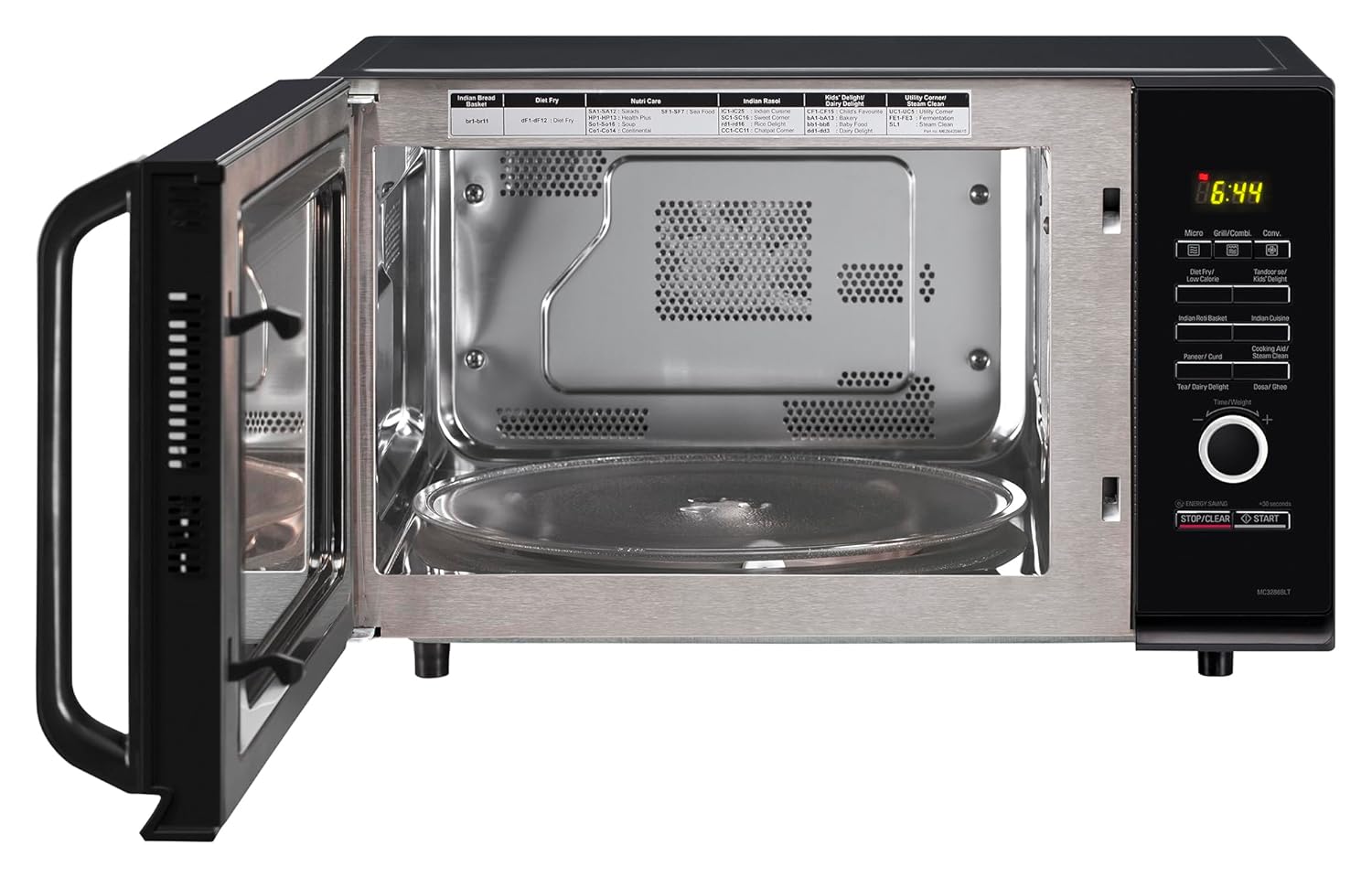 Special Features: Ghee in 12 Mins (time may vary model to model); Diet Fry; Door Orientation – Side Swing; Quartz Heater; Installation Type – Hassle Free Counter Top; Stainless steel cavity; Turntable diameter (glass) – 34 cm; reheat; Interior light; Motorized rotating function for even / uniform cooking; Healthy Cooking features; Overheating Protection; Timer; Cooking completion alarm; Defrost; Steam Chef; Child Lock: Ensures complete safety especially for homes with young children