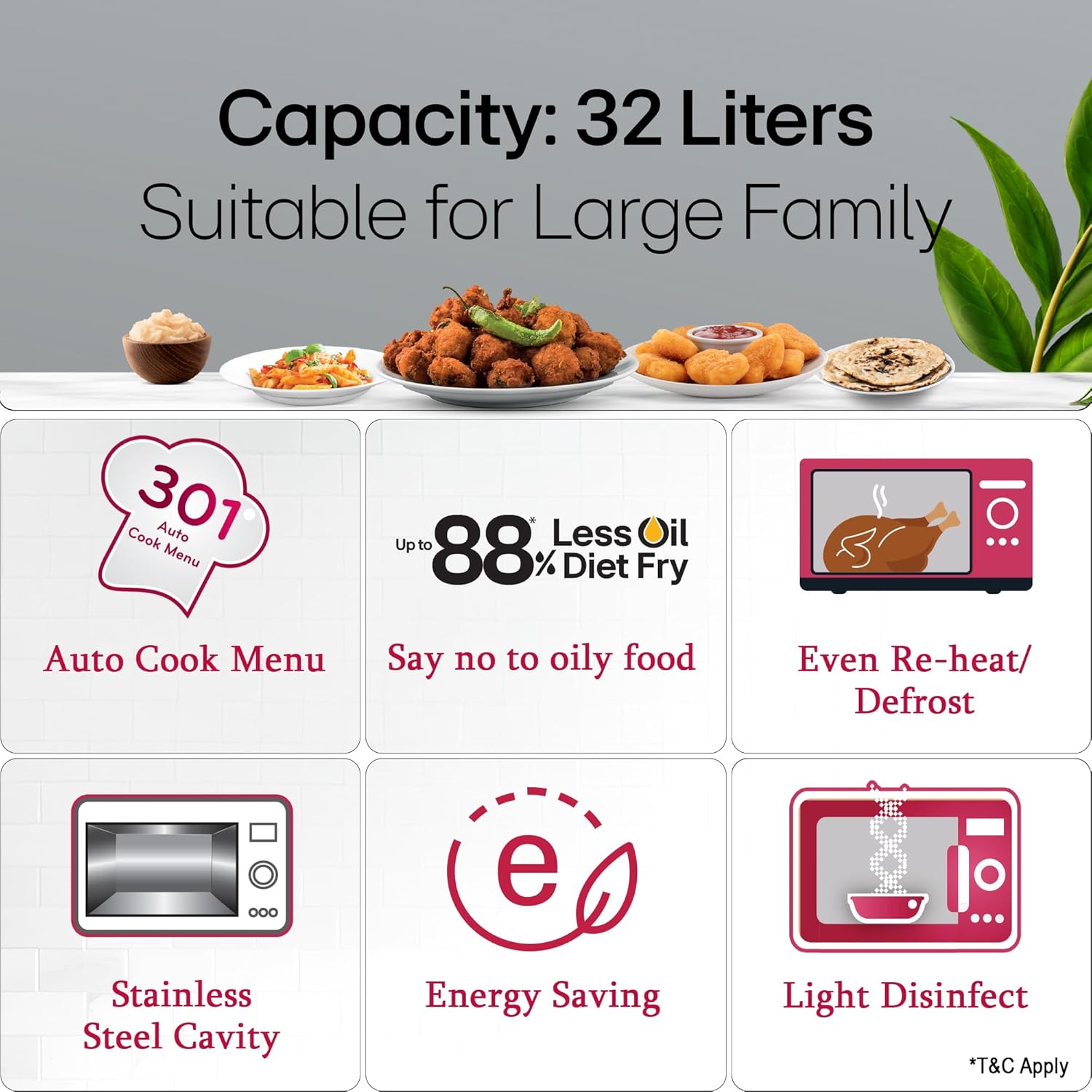 Capacity: 32 Litres – Suitable for large families, Microwave – safe glass / Plastic / Bowls / Trays, can place inside this microwave