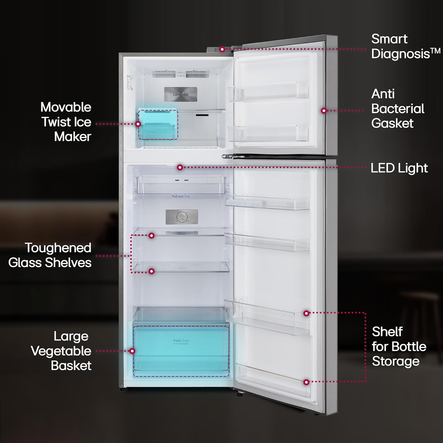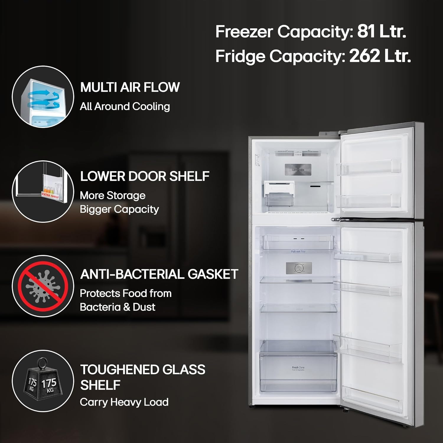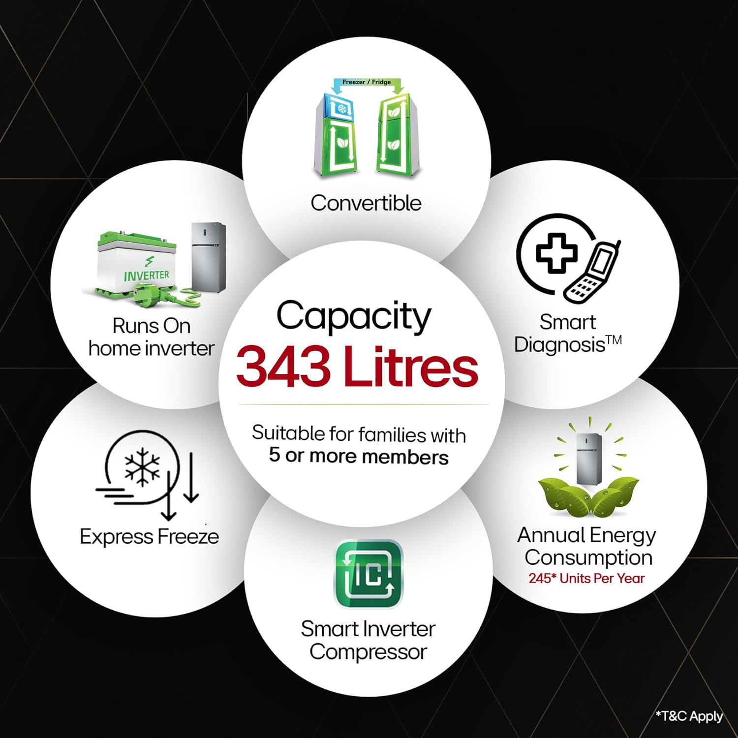 Special Features: Convertible – Freezer to fridge conversion offers you more space to suit your needs, Multi Air Flow – Distribute and circulate cool air to every corner for proper and even cooling; Temperature Control- I Micom, Express Freeze, Smart Diagnosis – Detects problem automatically