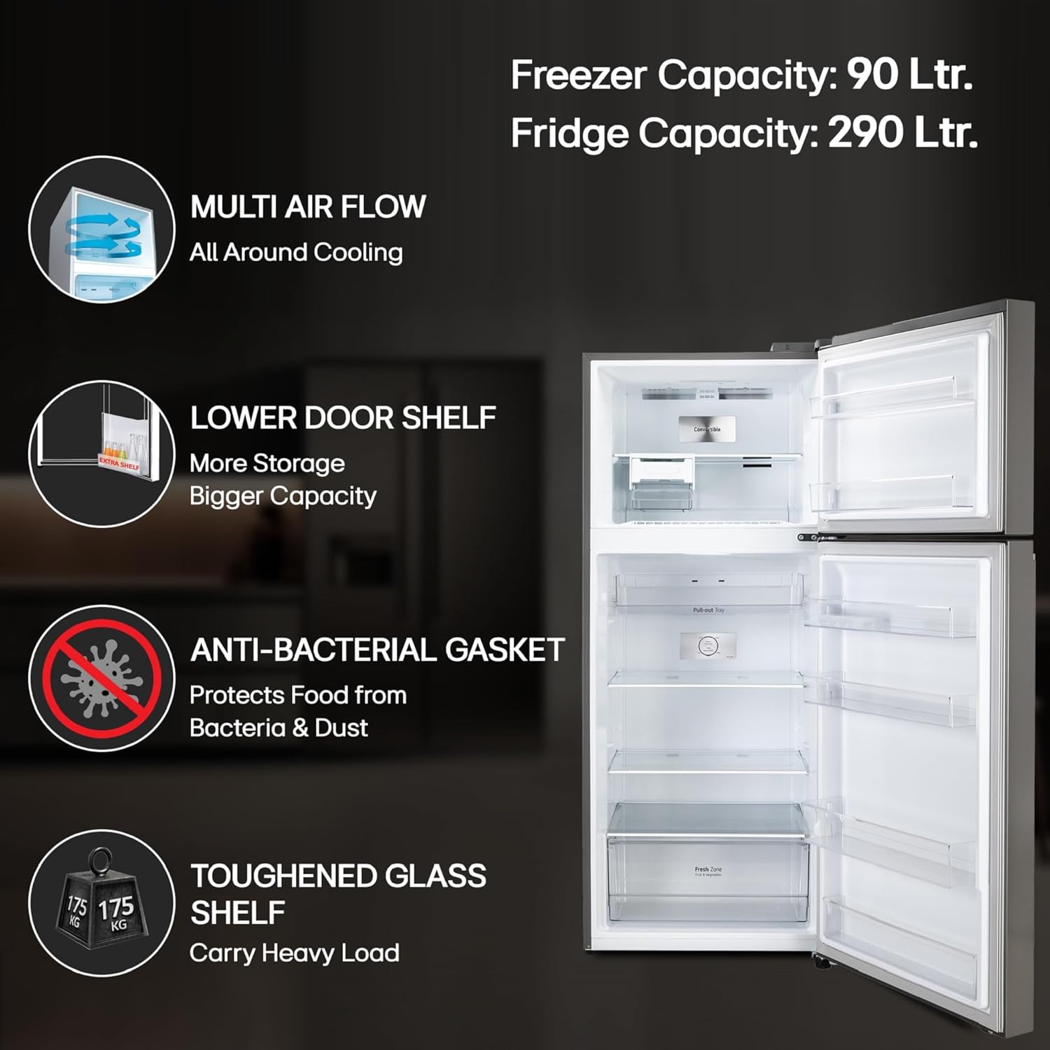 Additional Features: Multi-Air Flow cooling system- maintains optimal humidity and temperature levels so your food stays fresher for longer; Anti-Bacteria Gasket: prevents the entry and build-up of fungi and bacteria inside the refrigerator; Works without Stabilizer (100~310V); Chiller- Pull out Tray; Handle Type- Pocket
