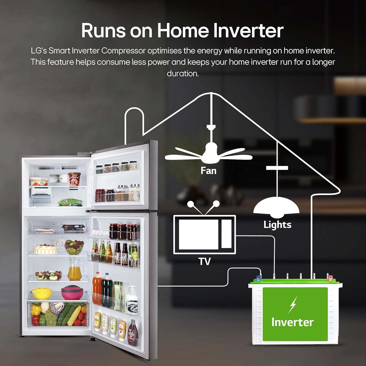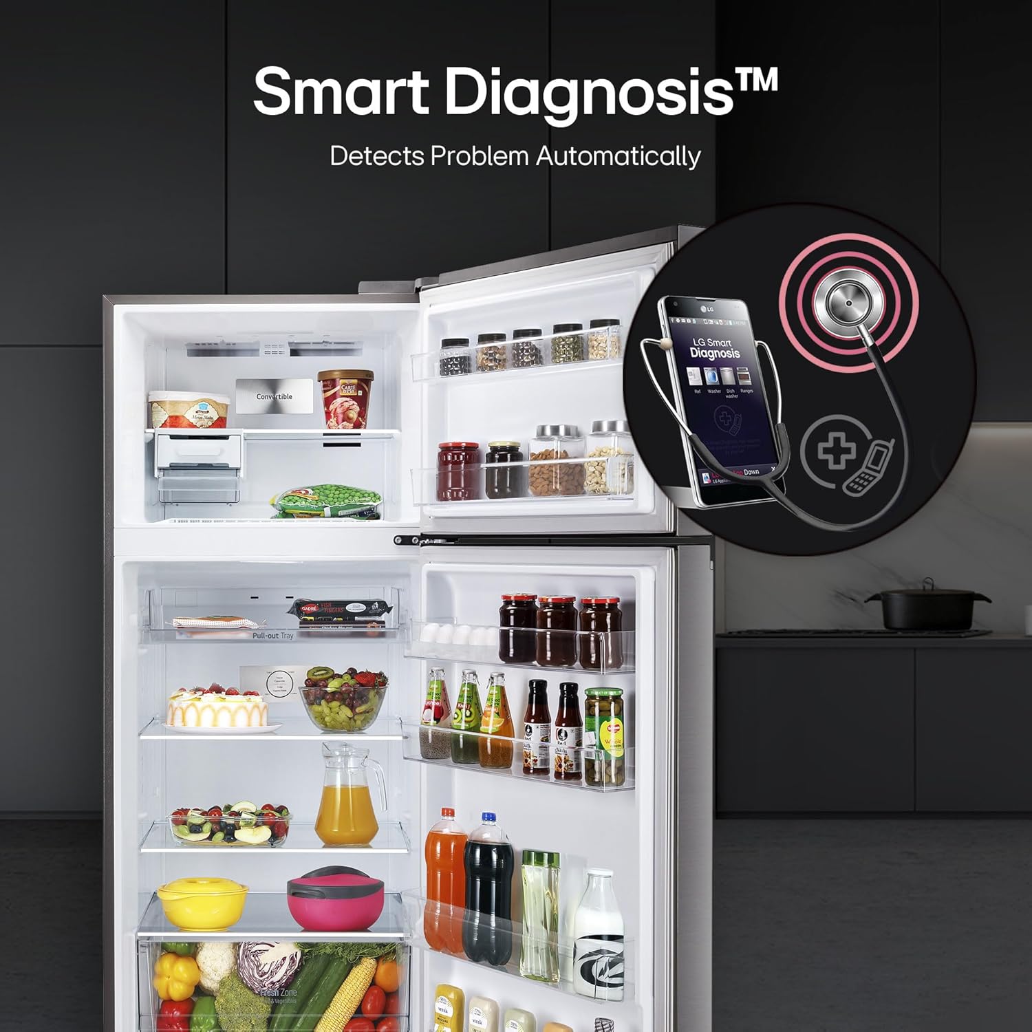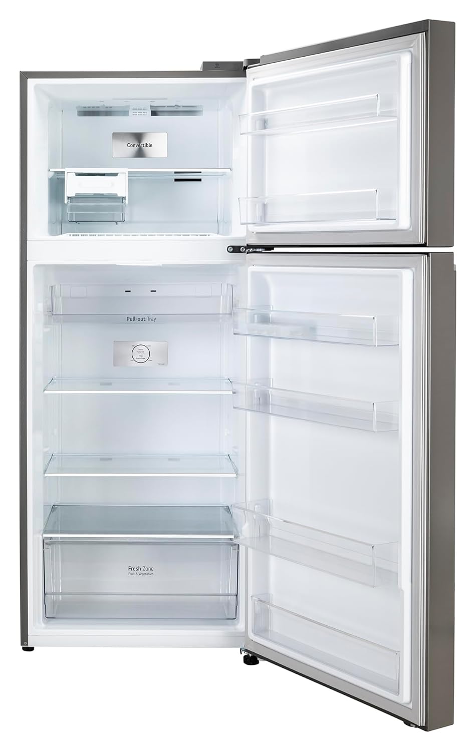 LG Exclusive Features: Offers you more space to suit your needs, Convertible- to convert and control two compartments of the double door refrigerator, Express Freeze- increases both the amount of ice made and freezing capabilities; Smart diagnosis- is a fast and easy way to troubleshoot issues; Smart Connect- helps connect your double door refrigerator to home inverter; Deodorizer