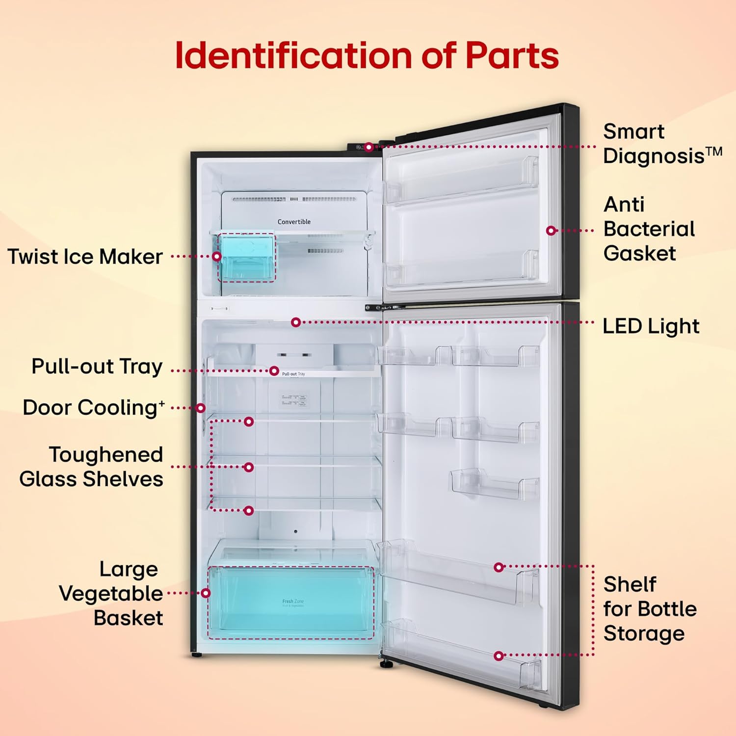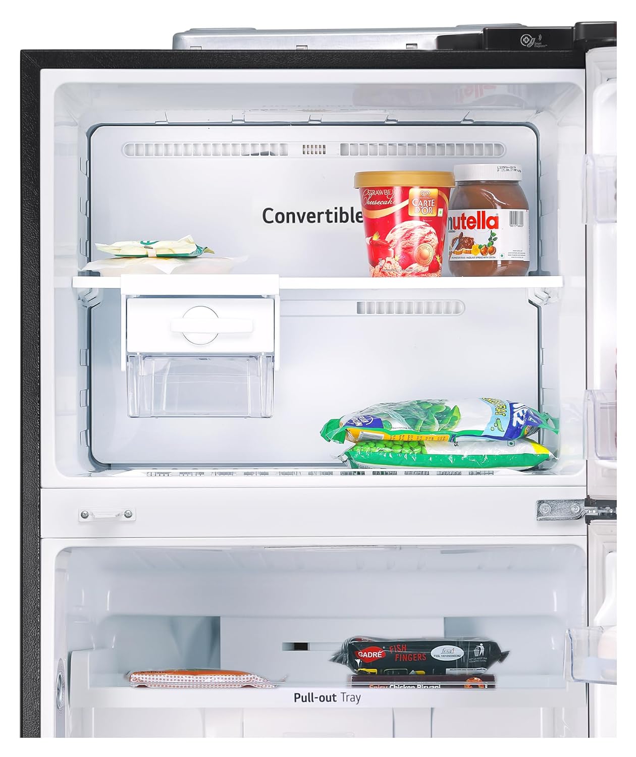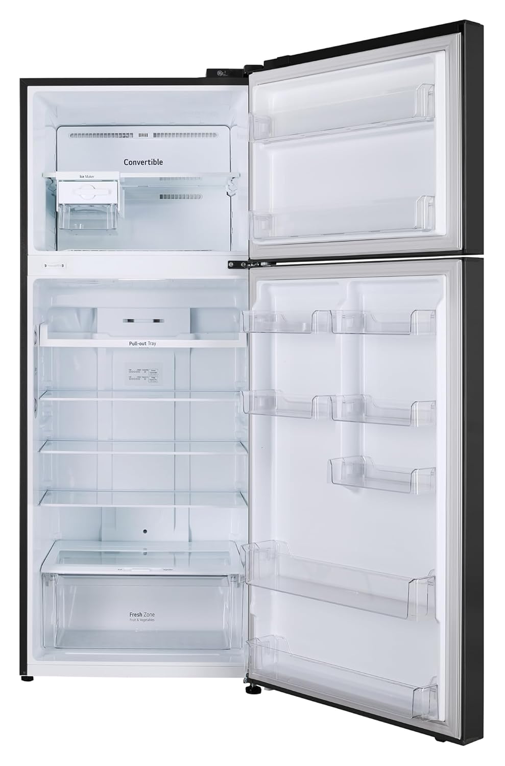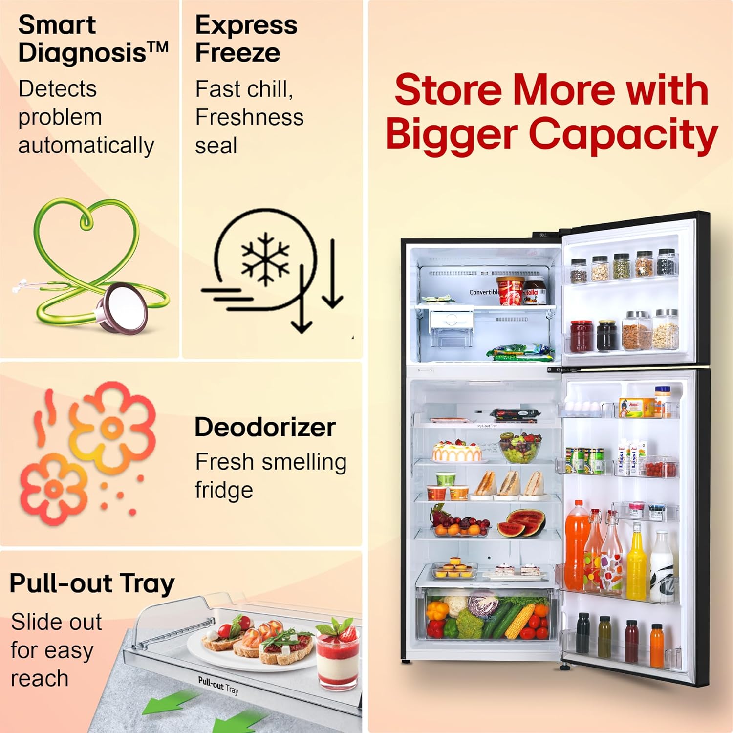 Key Features: Convertible – Freezer to fridge conversion, offers you more space to suit your needs; Door Cooling+ – 35% faster cooling; Temperature Control – I Micom Tact; Express Freeze – for preserving food quality and nutrients, and it also helps achieve desired freezing temperatures; Smart Diagnosis – Detects problems automatically; Deodorizer – free from unpleasant smells; Anti-Bacteria Gasket for hygiene and food freshness; Humidity Controller – maintains moisture and temperature levels to keep fruits and vegetables fresh and nutritious; Works Without Stabilizer (100 ~ 310V)