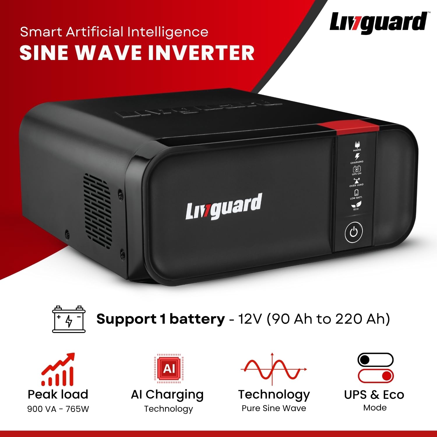 Livguard Sineverter Pro 900VA/12V Pure Sine Wave Inverter for Home, Office and Small Shops, Inverter with Smart Artificial Intelligence with 30 Months Warranty | Supports 1 Battery