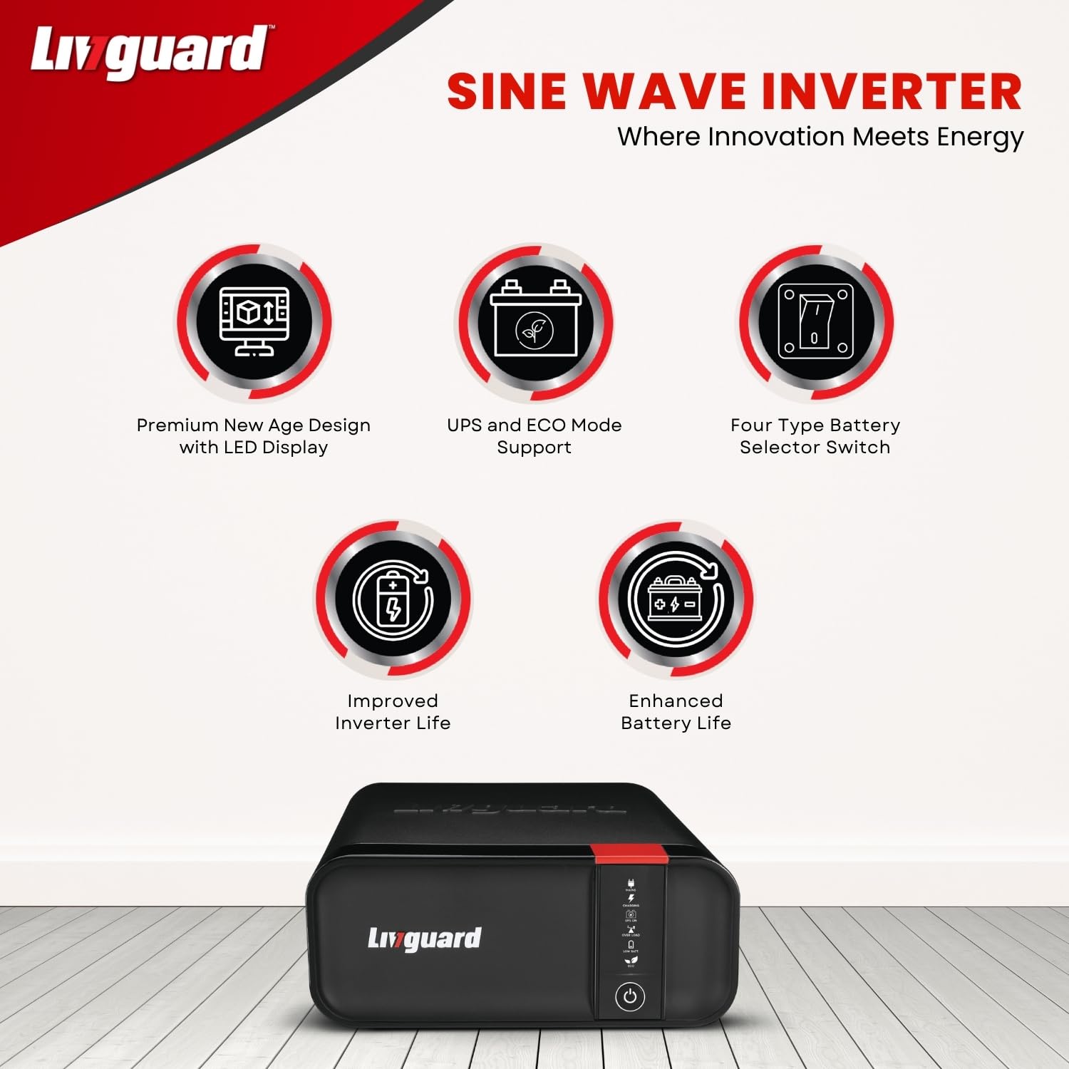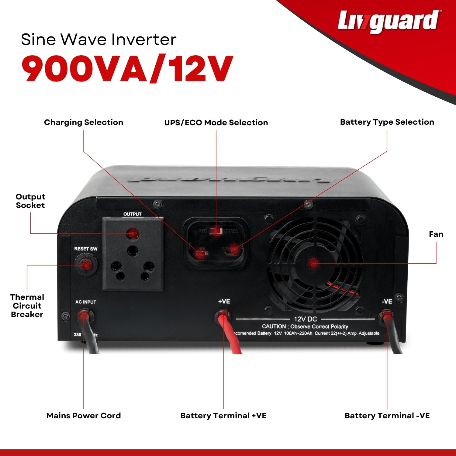 Battery Compatibility – Compatible with 1 X (12V) C20 battery of Capacity Between 90 Ah – 230 Ah Battery. The 4-mode selector switch enables compatibility with a wide range of Batteries Like Flat Plate, Tubular, SMF and LOCAL (To Be Purchased Separately) suitable for longer battery life.
