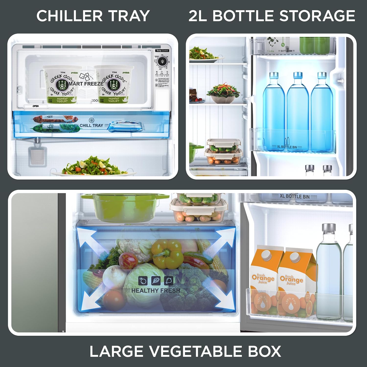 Spacious Vegetable Box: A large vegetable crisper offers ample room for fruits and vegetables. It helps maintain freshness with good humidity control, making it convenient for users who like to store a week’s worth of produce in an organized manner.