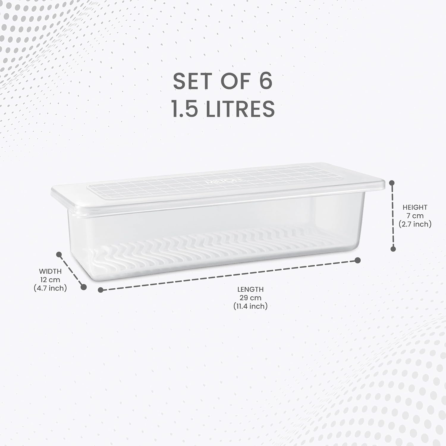 MILTON Cryo Fridge Storage Boxes Set of 6 Fridge Organizer Container with Waterproof Vinyl Stickers & Removable Drain Plate, Lid, Stackable Box, Plastic Containers 1500 ml, Transparent