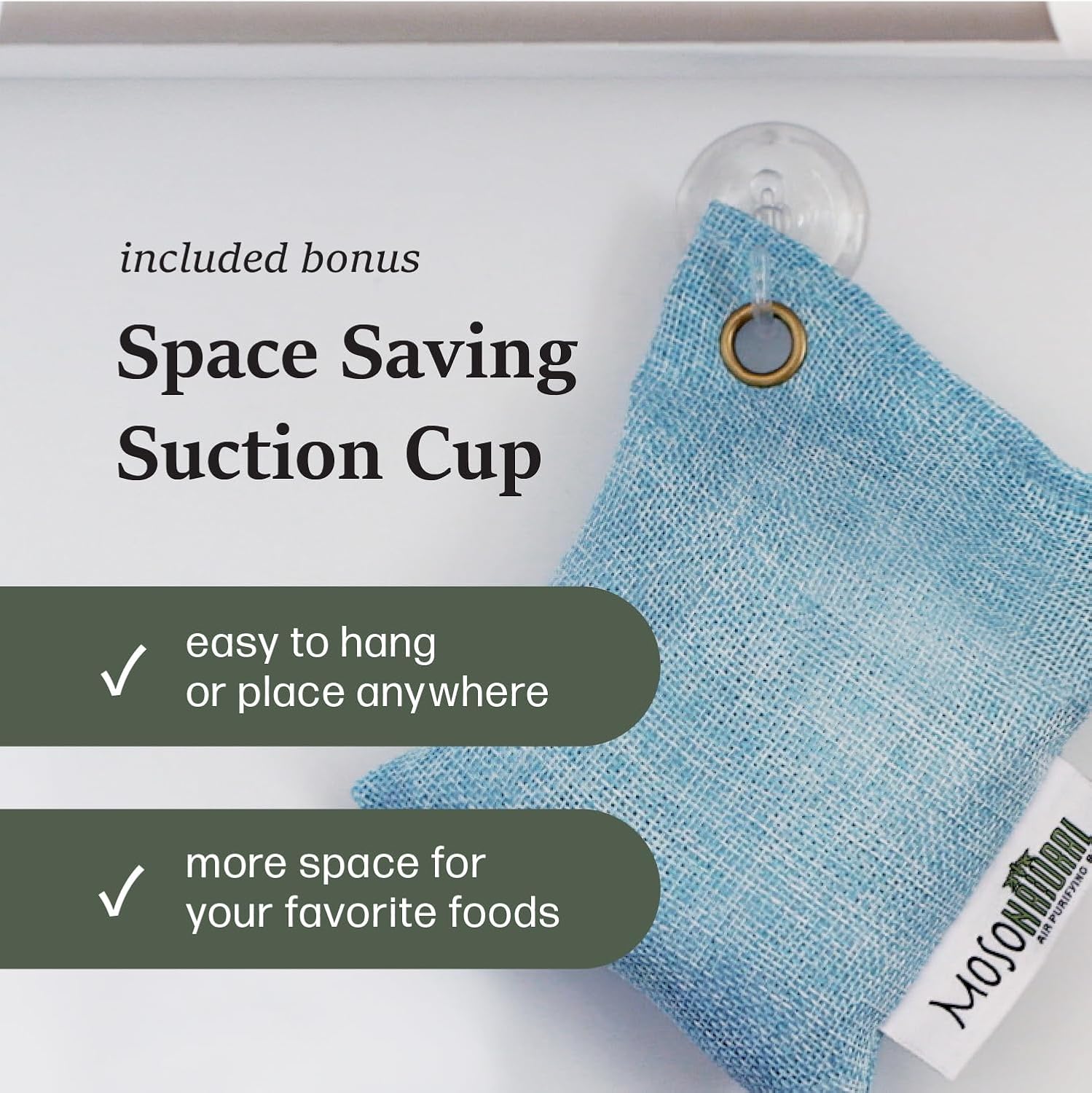 USE IN SMALL AREAS: Perfect for Refrigerators, Freezers and Coolers. Metal grommet with included suction cup allows you to place your Moso Bag out of the way.