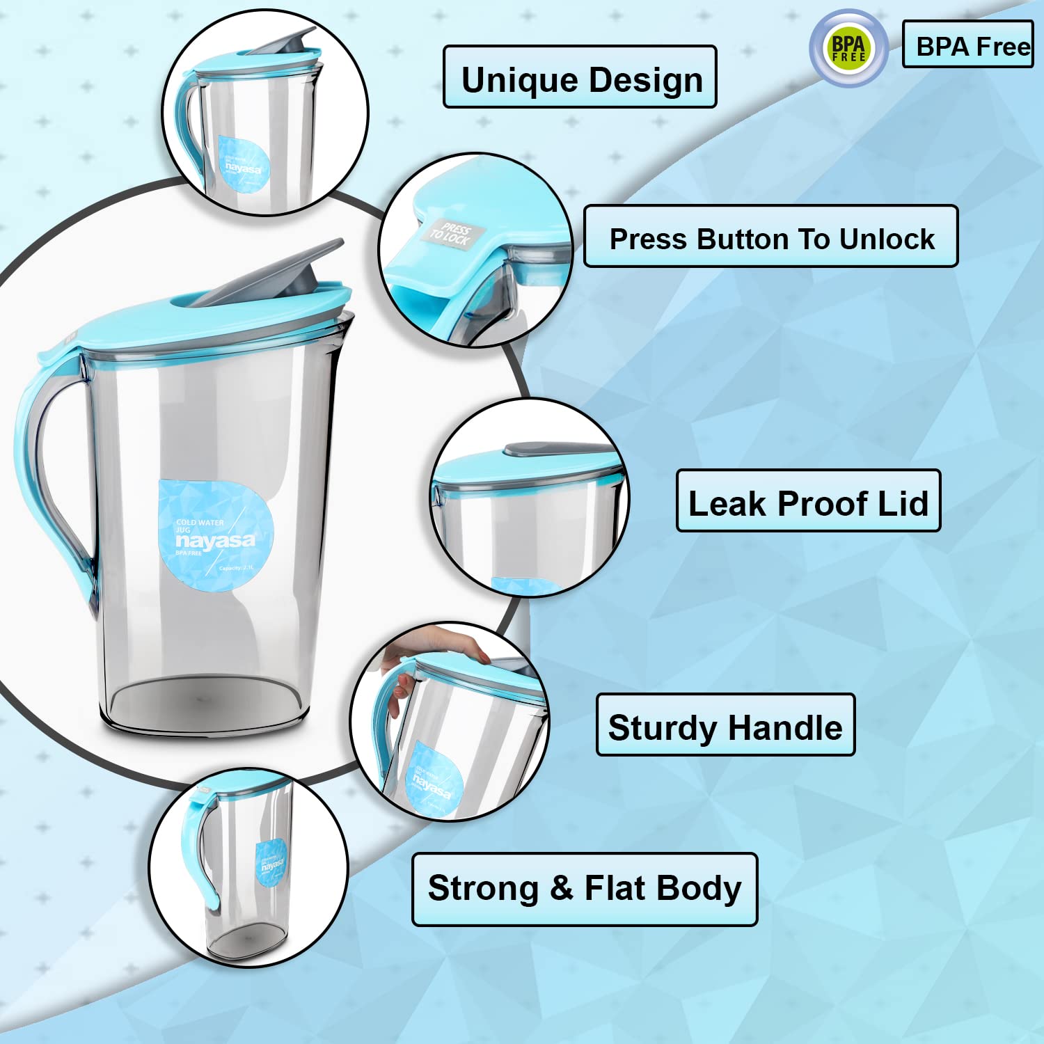 Nayasa Icon Jug- 2100 ML, Cold Water Jug with Lid, Study Handle, Press Lock Button to Open, Leakproof Lid, Strong & Flat Body, Glass Finish Look, Ideal for Home & Offices, Blue