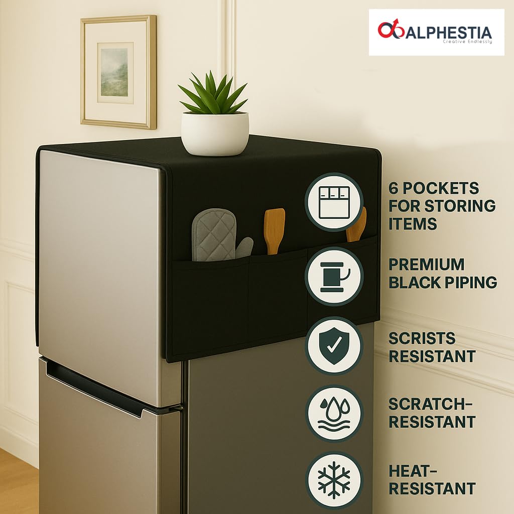 ALPHESTIA Fridge Top Cover: The ultimate refrigerator cover for single-door fridges, blending protection and style. This fridge top cover is expertly designed to shield your appliance from dust, dirt, scratches, and spills, ensuring it remains in pristine condition for years. As a premium refrigerator cover, it not only protects but also enhances your kitchen decor. This refrigerator cover, thoughtfully designed as a top cover for fridge, effectively extends your appliance’s lifespan, saving you money and hassle. Crafted from high-quality and durable fabric with an inner water-resistant coating, this refrigerator top cover offers superior protection against moisture and stains. Easy to clean and maintain, this fridge cover, designed specifically for single-door refrigerators, guarantees a snug and secure fit. The ALPHESTIA Fridge Cover for Single Door Refrigerator adds a touch of elegance to your kitchen while providing essential protection. What sets this fridge cover apart is its smart storage solution. Featuring six strategically placed pockets, this fridge cover for top with pockets offers ample space to keep your kitchen essentials organized and within easy reach. Store gloves, bills, pens, spatulas, and other small items conveniently with this practical refrigerator cover. A versatile fridge top cover, it’s a must-have for every home. This refrigerator cover is more than just a protective accessory; it’s a statement of style. As a top cover for fridge, it seamlessly integrates with any kitchen decor, keeping your space neat and visually appealing. The ALPHESTIA Fridge Top Cover is designed to complement your personal style, making it a perfect addition to your home. Easy to install and maintain, this fridge top cover effortlessly shields your refrigerator from the rigors of daily wear and tear. Choose the ALPHESTIA Fridge Top Cover, a refrigerator cover that combines unparalleled style and reliable protection.