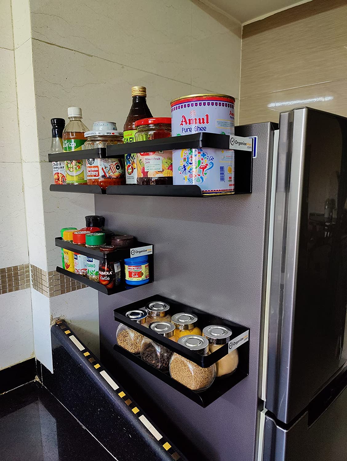 OrganizeMee Kitchen Organizer Storage Spice Magnetic Rack, Decorate Your Fridge,Washing Machine & Microwave Oven with Magnetic Metal Fridge Side Rack Organiser Rack Shelf (Black)-SET4