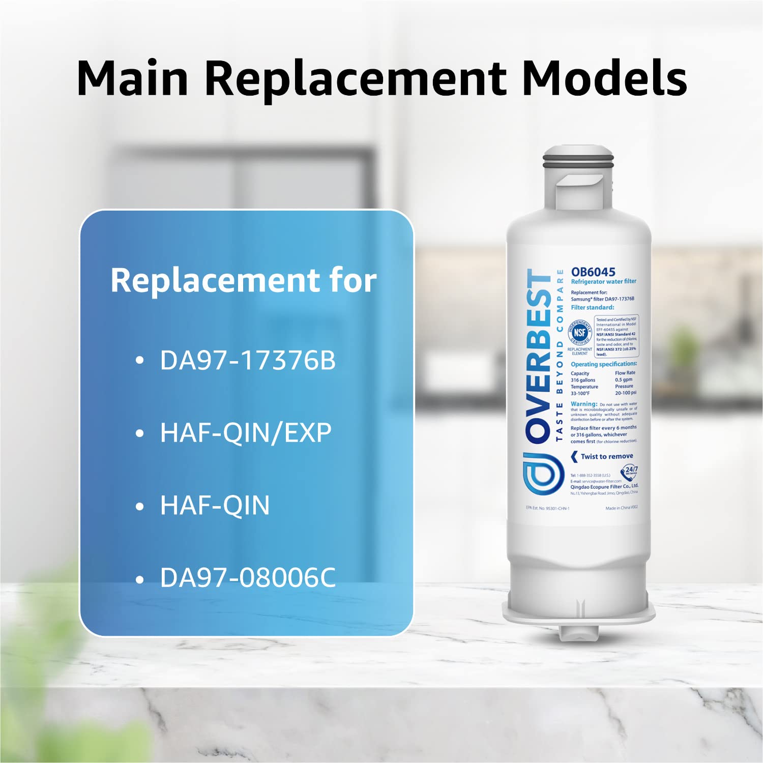 [Replacement for Refrigerator Filter Models] This Overbest refrigerator filter is a replacement for Samsung DA97-17376B, DA97-08006C, HAF-QIN, HAF-QIN/EXP, GF-841, CF-17, AQF-FF45, WS645A, FL-RF45, MB-F45, RWF4200A, PP. -RWF420 0A-S