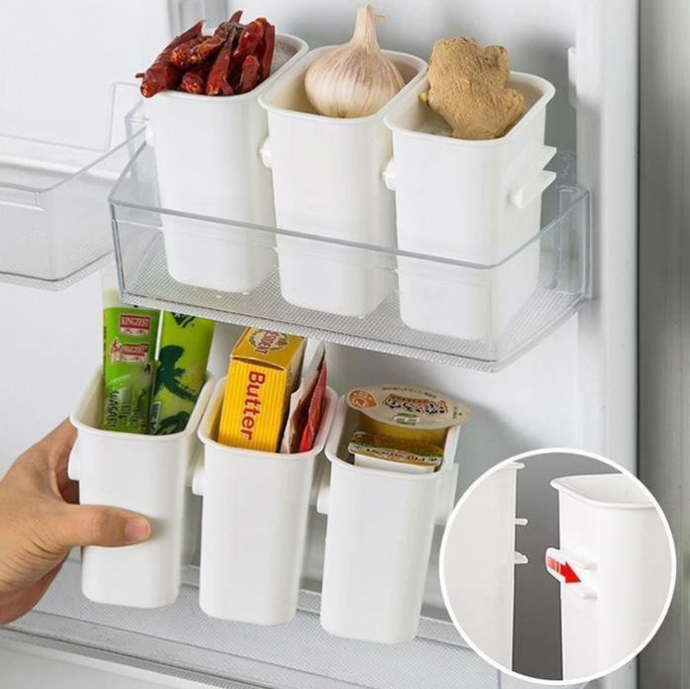 BUCKLE DESIGN: The fridge storage container can be fitted into your refrigerator side door and can be freely detached and reattached depending on the space, so it can hold all kinds of items at home, such as small fruits, chocolate, chilli pepper, sausage, garlic, ginger, candies, butter cubes, etc.